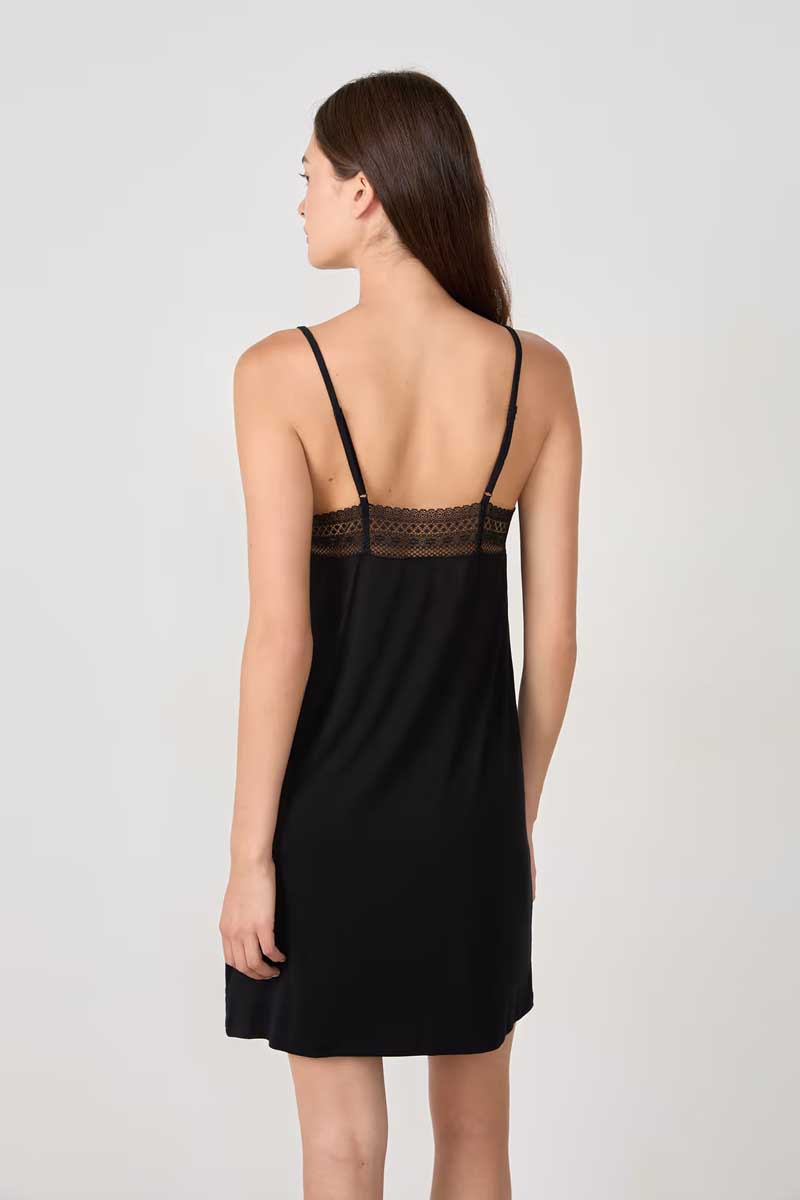 “Elegance and delicacy… This nightdress with thin straps reveals a neckline adorned with fine lace. With its fitted cut, it promises comfortable and stylish nights.”