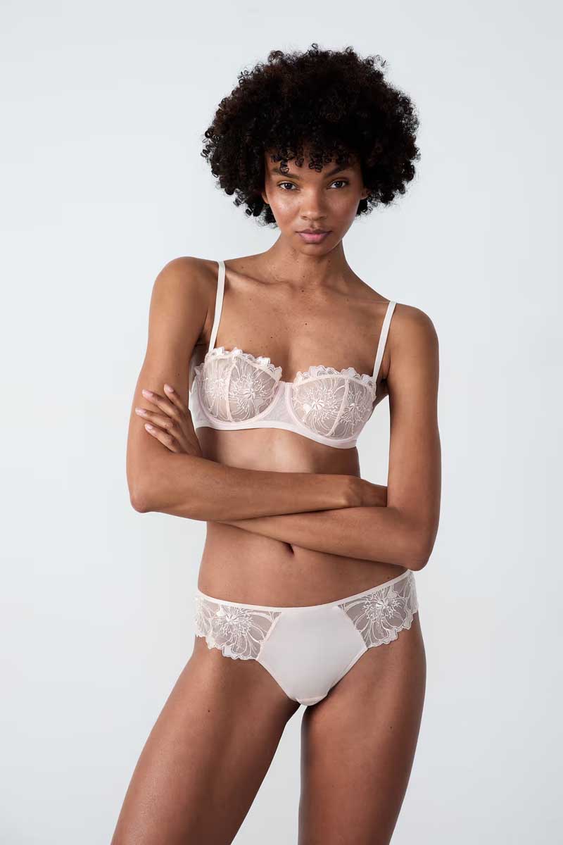 “A delicately satiny material is surrounded by embroidered tulle. Floral patterns are revealed through sheer layers, enhancing this feminine and sensual piece of lingerie.”