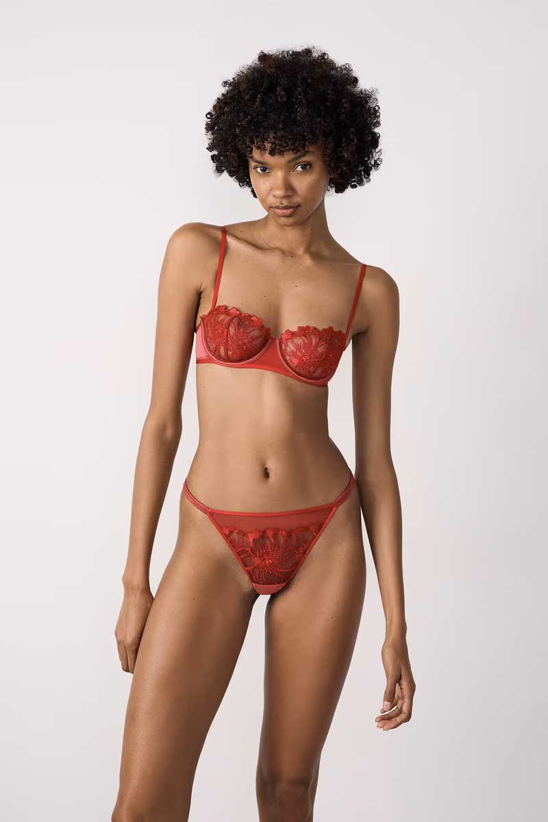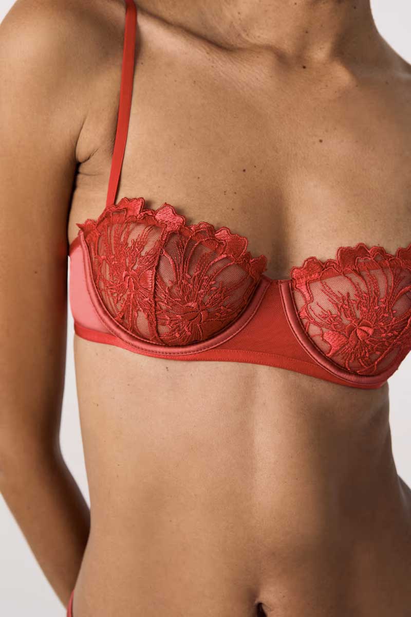 The tulle is delicately embroidered with stitching patterns on this bra with satin details. Unpadded to naturally enhance the bust. Bra Demi-cup Embroidered Adjustable straps Back-fastening hooks