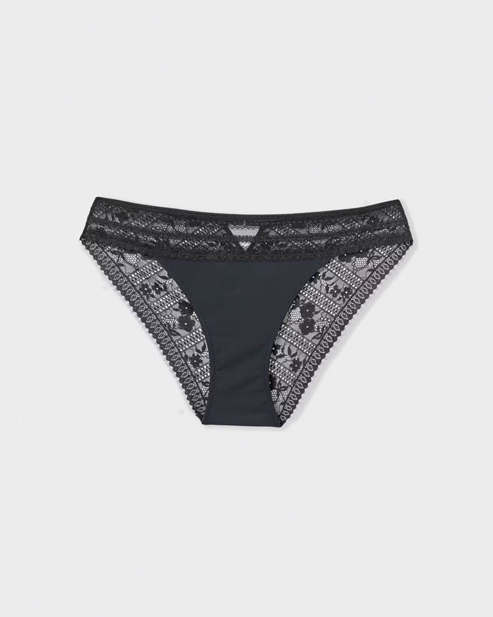 “The new everyday lingerie, both sexy and comfortable.The eyelash lace band of these briefs combines floral motifs and graphic stripes.”