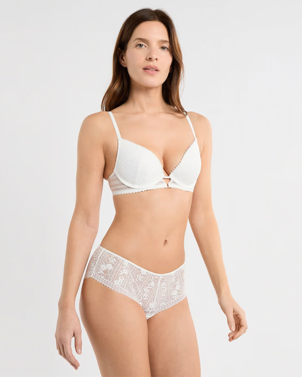 “The new everyday lingerie, both sexy and comfortable. The eyelash lace of this bra combines floral patterns and graphic stripes. Its push-up cups offer a boosted, plunge neckline, while the ring at the center adds a touch of elegance.”