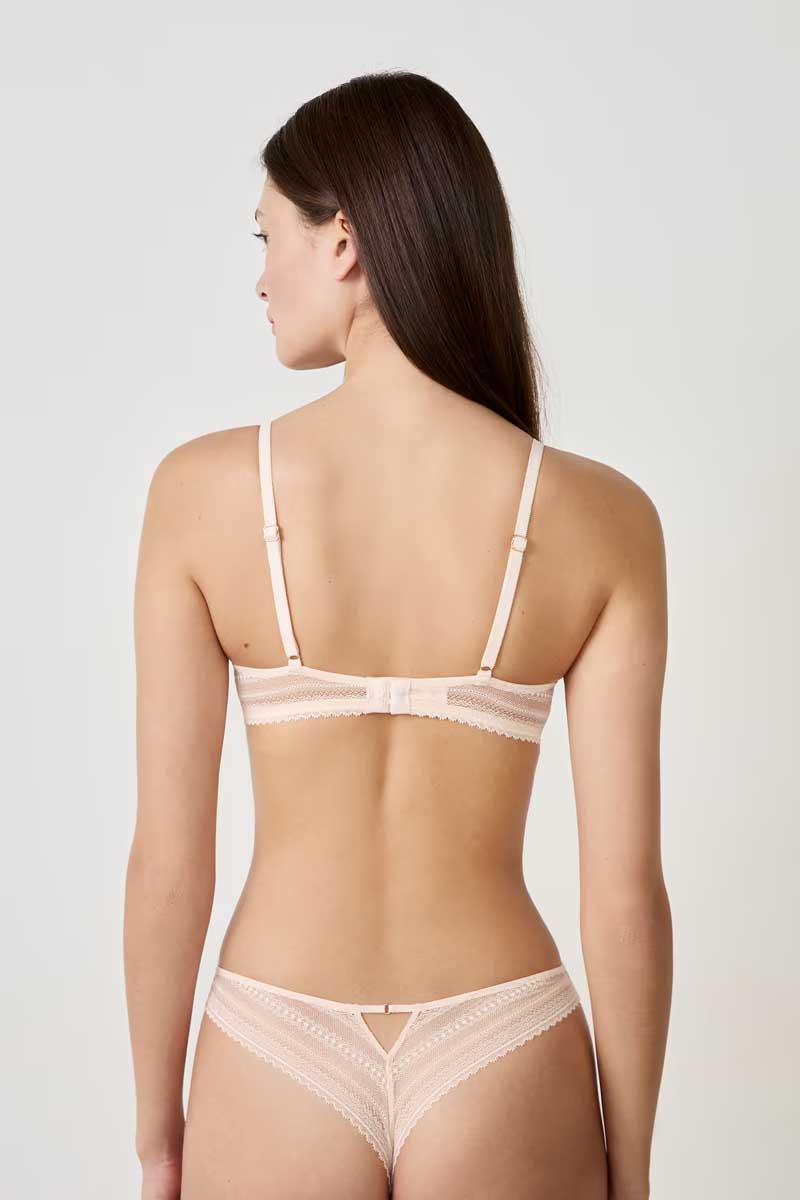 “The new everyday lingerie, both sexy and comfortable.The lace of this bra combines floral patterns with an eyelash effect and graphic stripes.Its push-up cups offer a boosted and plunging neckline, while the ring at the center gore adds a touch of elegance.For optimal support, it offers 4 adjustment positions at the back.”