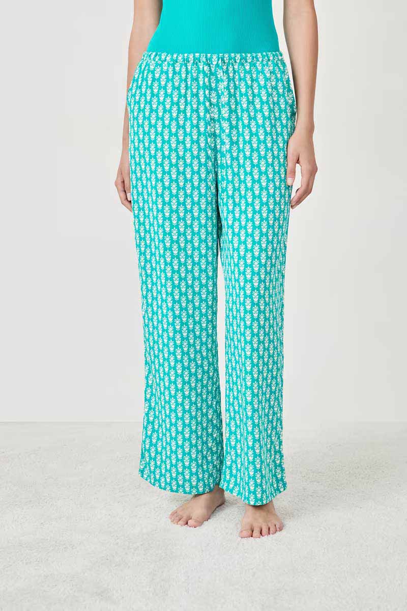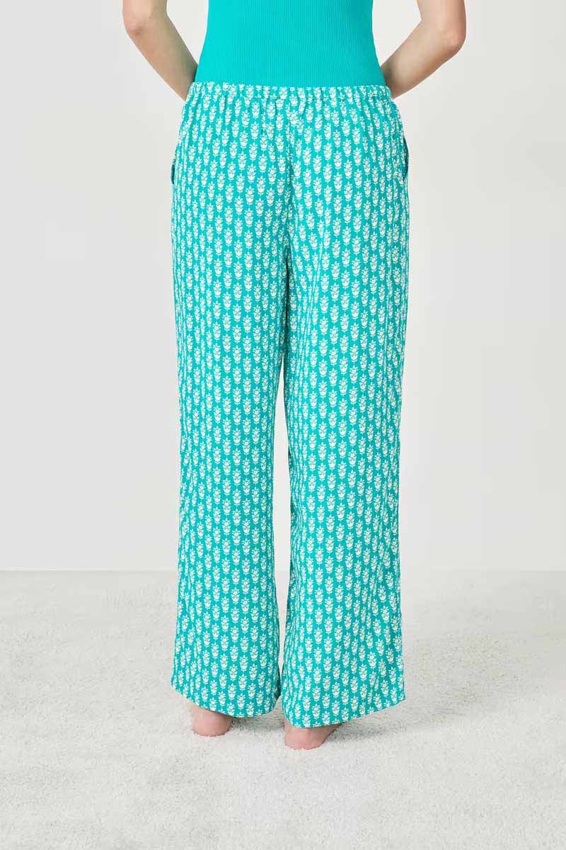 “These lightweight pajama pants feature a sophisticated print.Their elastic waistband adds structure to the silhouette, while their two side pockets add a practical touch.”