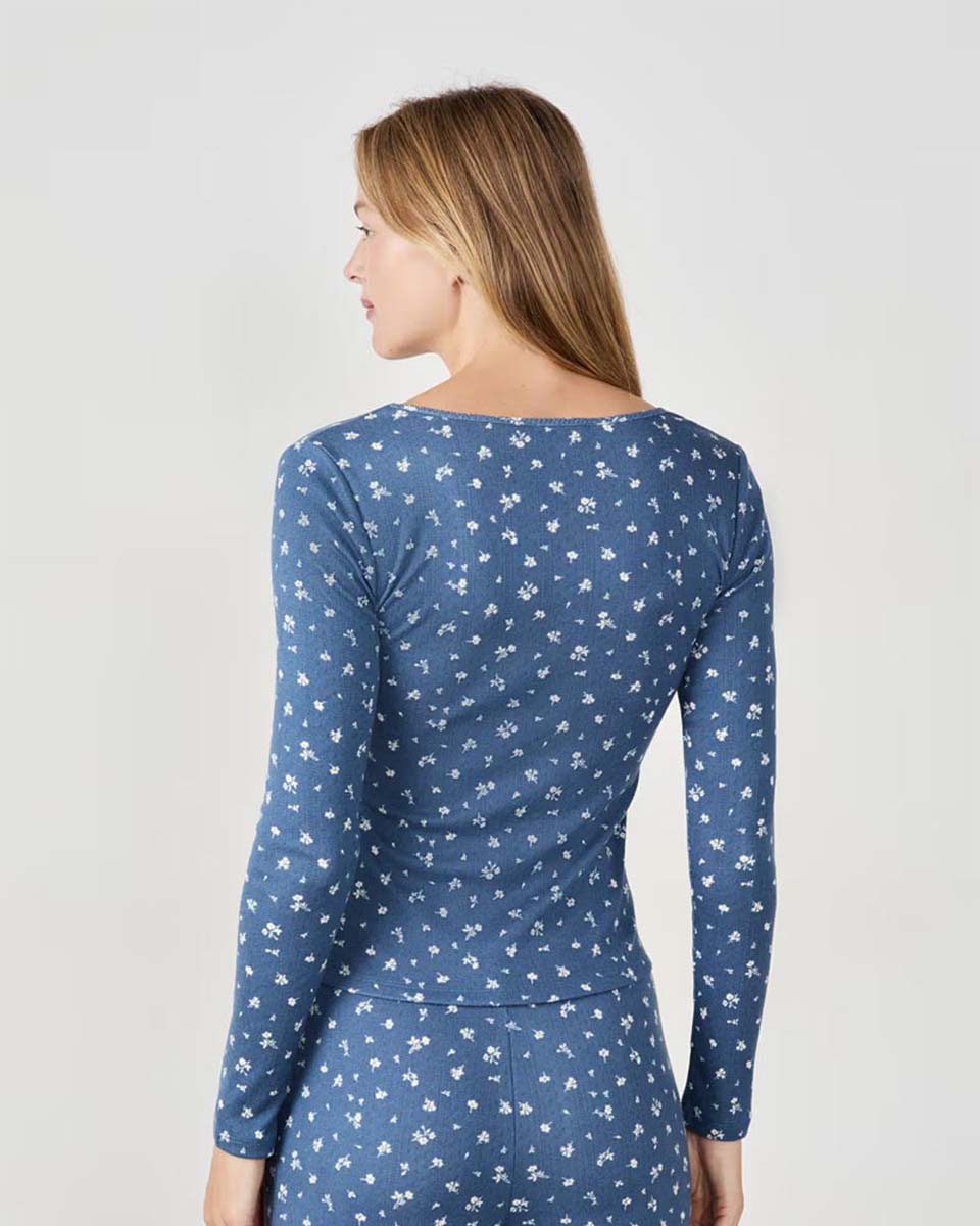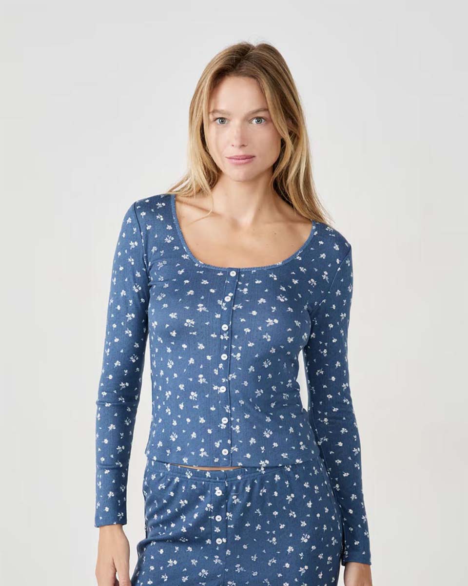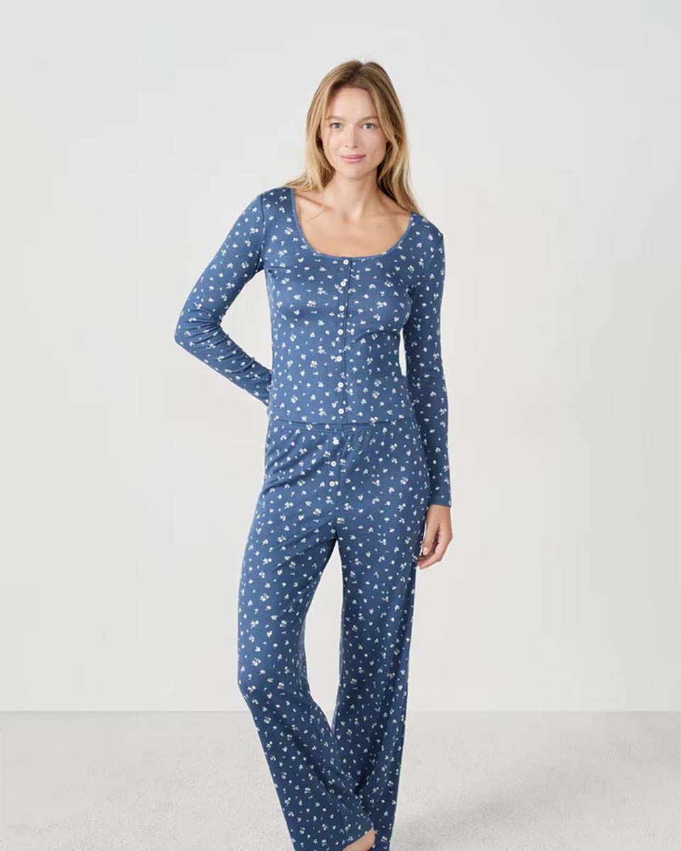This pyjama t-shirt features a floral pattern and button-up closure. It pairs with the matching trousers.