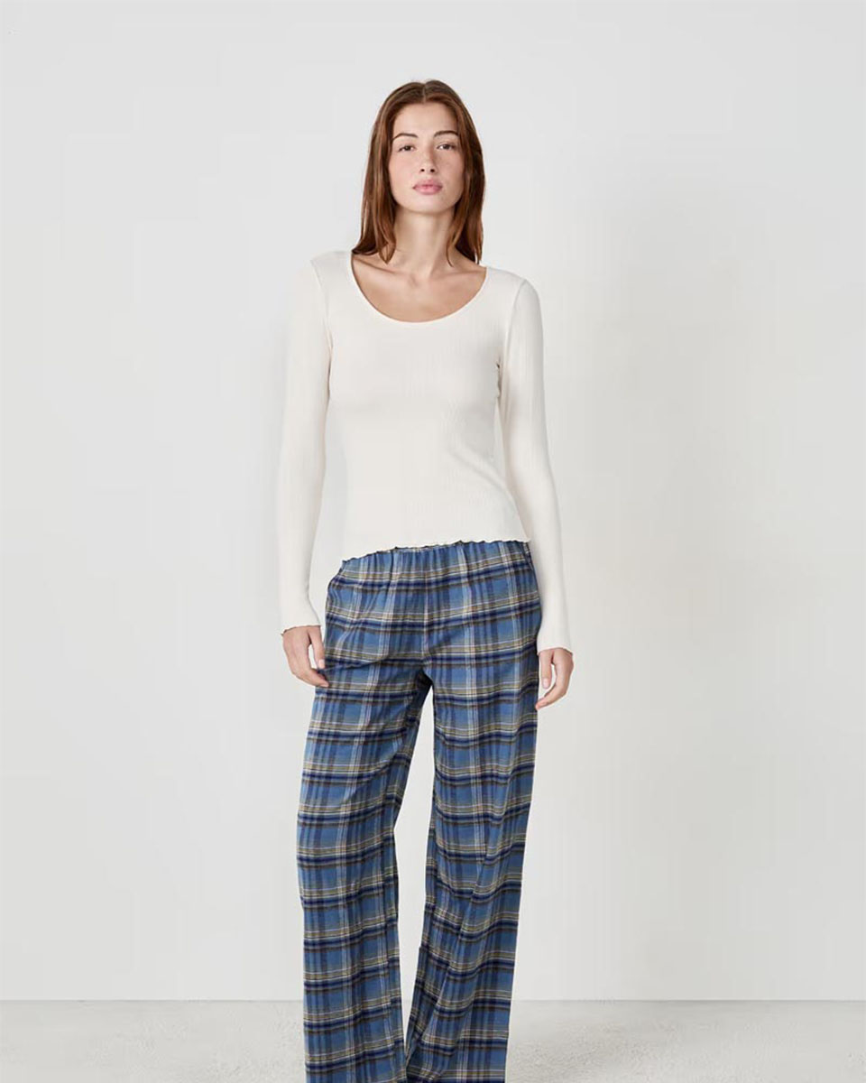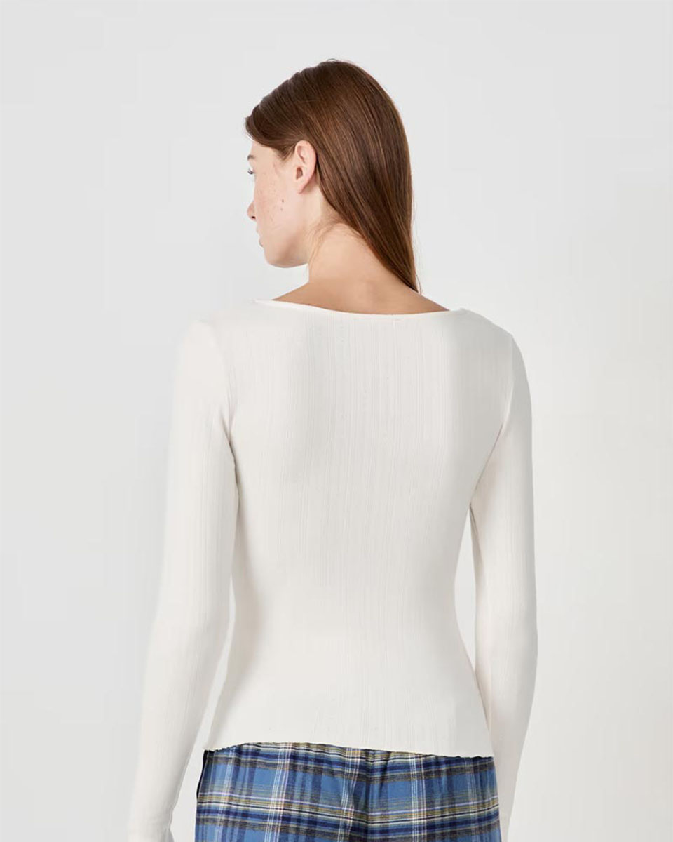 “An essential piece for your nighttime wardrobe, this t-shirt is a must-have basic. Featuring a round neck and long sleeves, it’s given a fresh look with a ribbed effect.”