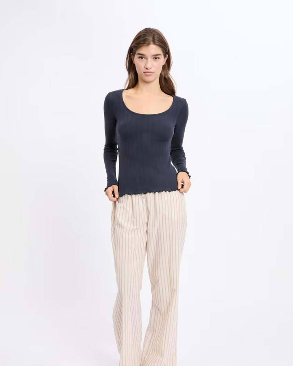 “An essential piece for your nighttime wardrobe, this t-shirt is a must-have basic. Featuring a round neck and long sleeves, it’s given a fresh look with a ribbed effect.”