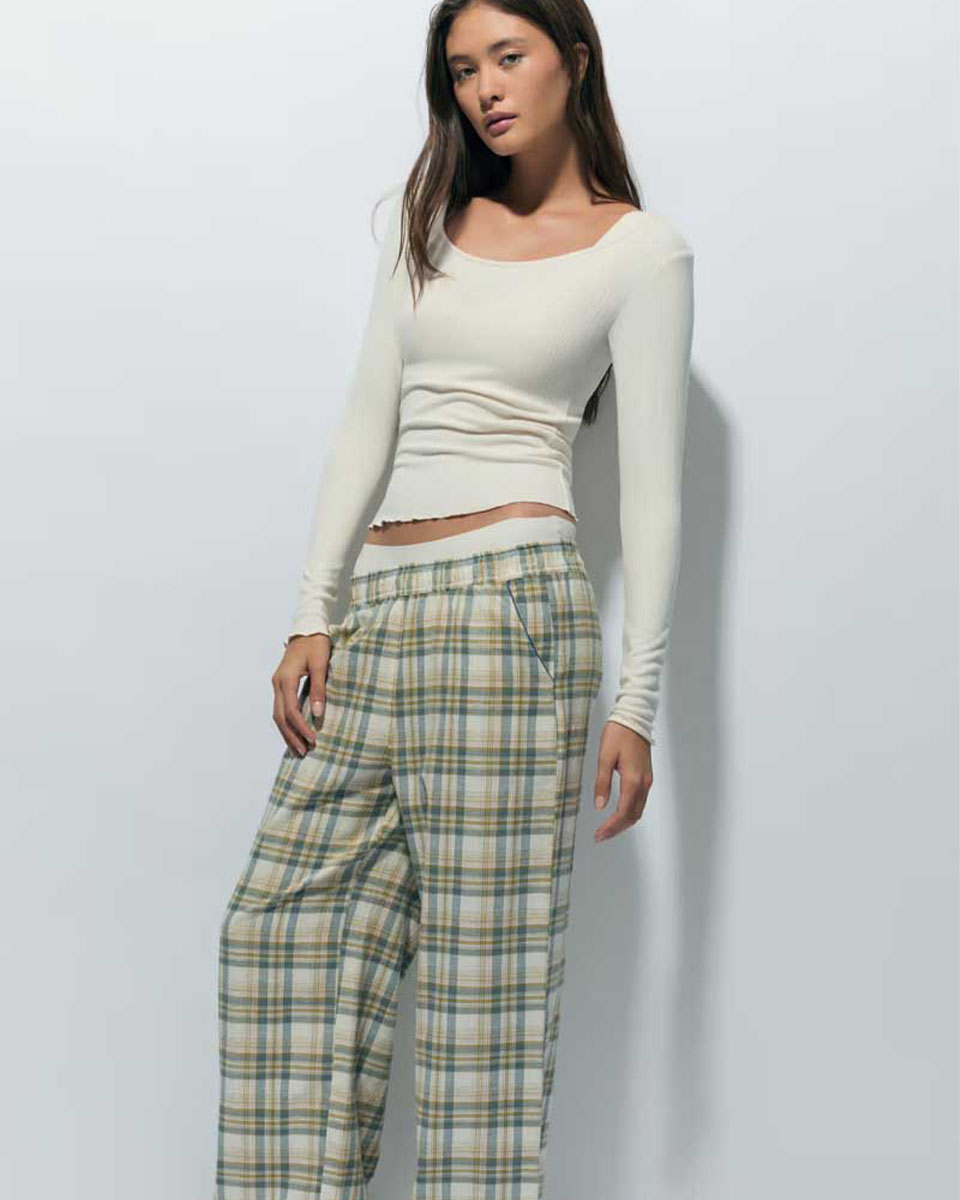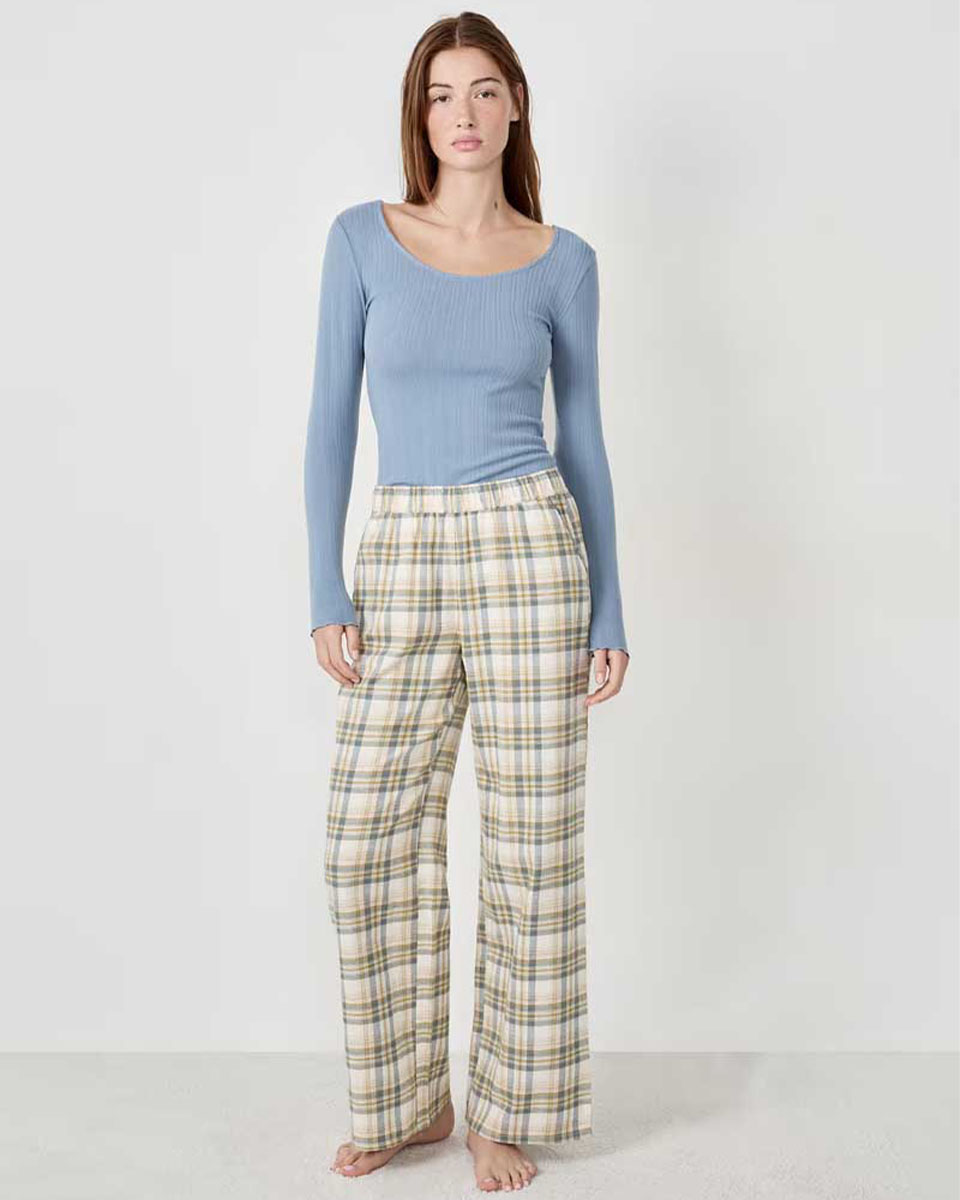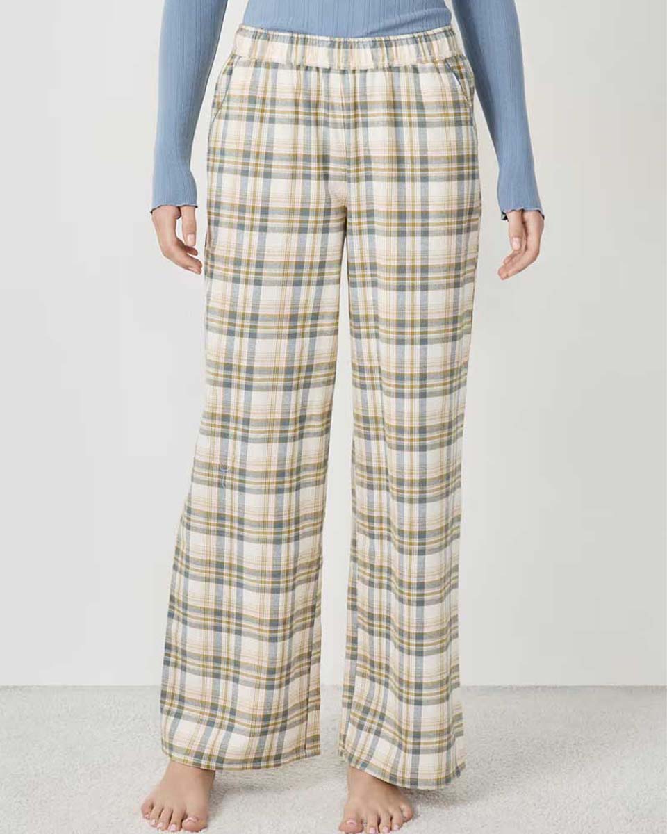 “A timeless basic for your sleepwear wardrobe, these checked trousers feature a wide, flowing cut. Ideal for soft and comfortable nights.”