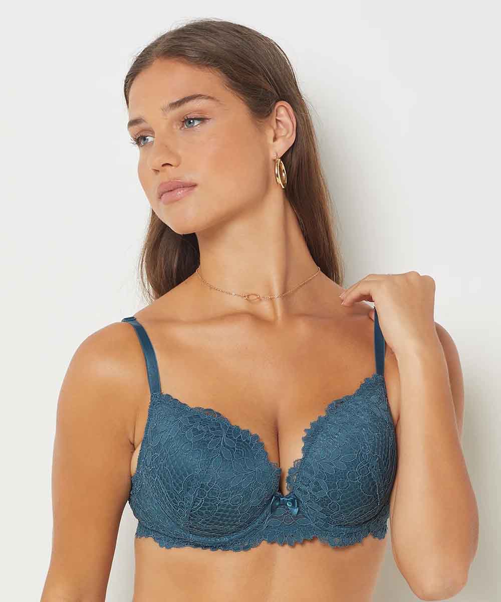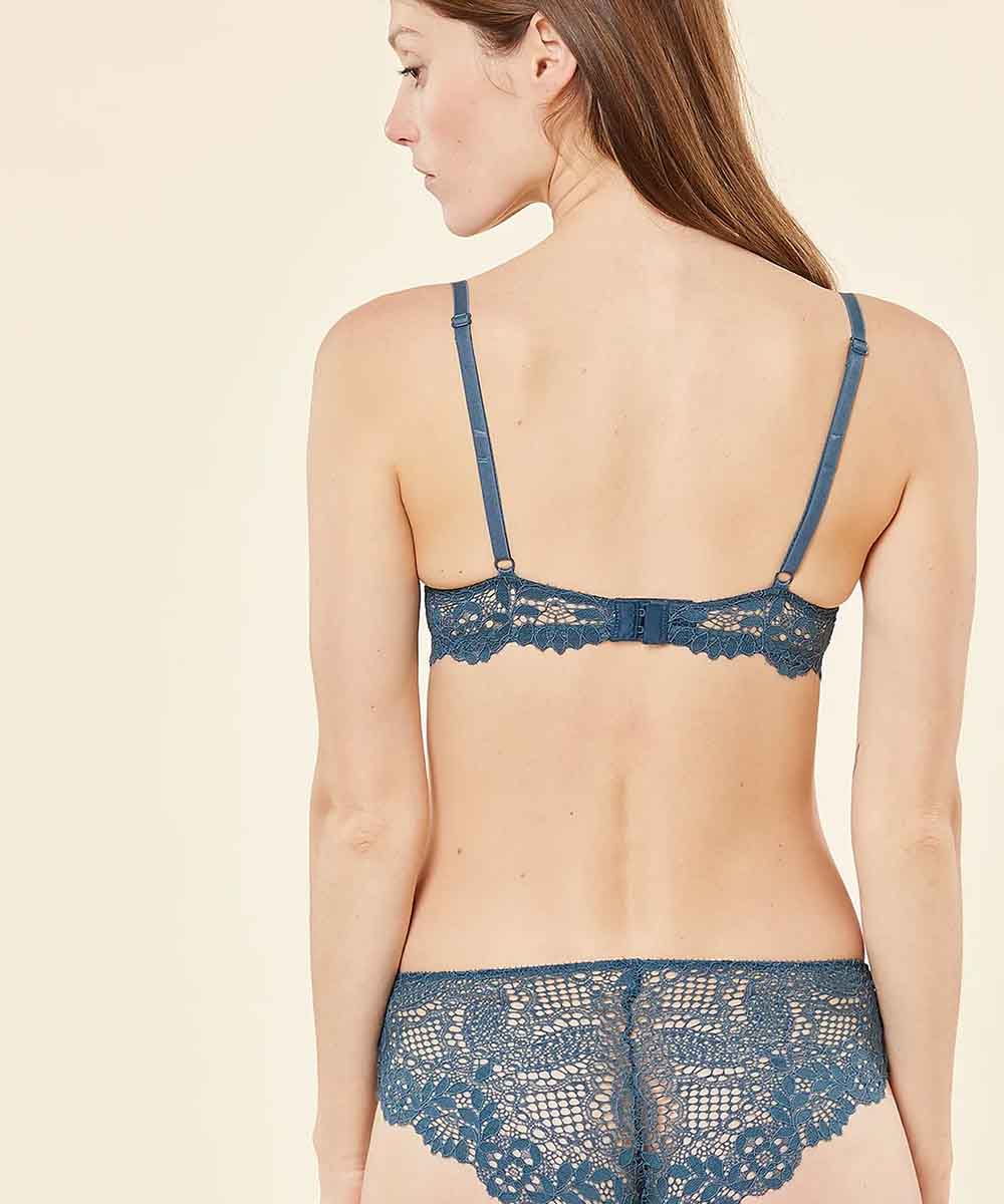 “A naturally enhanced bust: the light padding creates a pretty shape enveloped by floral embroidery. Bra No. 5 The natural look Lace Adjustable straps ò Back-fastening hooks WECARE This productÆs main fabric contains 54% recycled polyamide. The recycled polyamide is primarily made from manufacturing scraps and offcuts, which helps protect non-renewable resources and reduces waste. WeCare is certified by independent trustmarks such as GRS or RCS. Environmental and social criteria are incorporated throughout the chain, from the fabric to the finished product. The partner manufacturer has a certificate from a recent social audit carried out according to an independent certification entity guaranteeing decent working conditions. Find out more about our WECARE eco-friendly scheme and commitments here: Find out more”