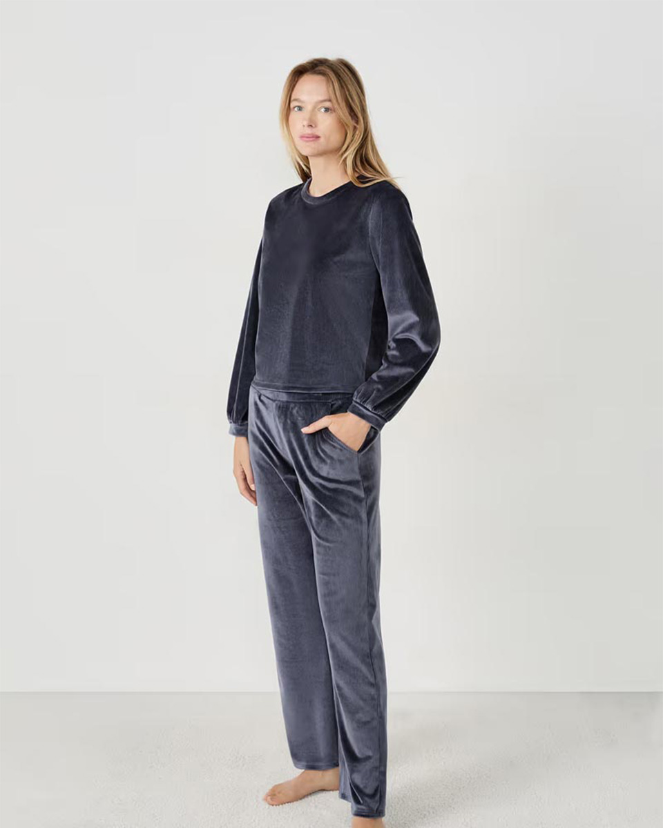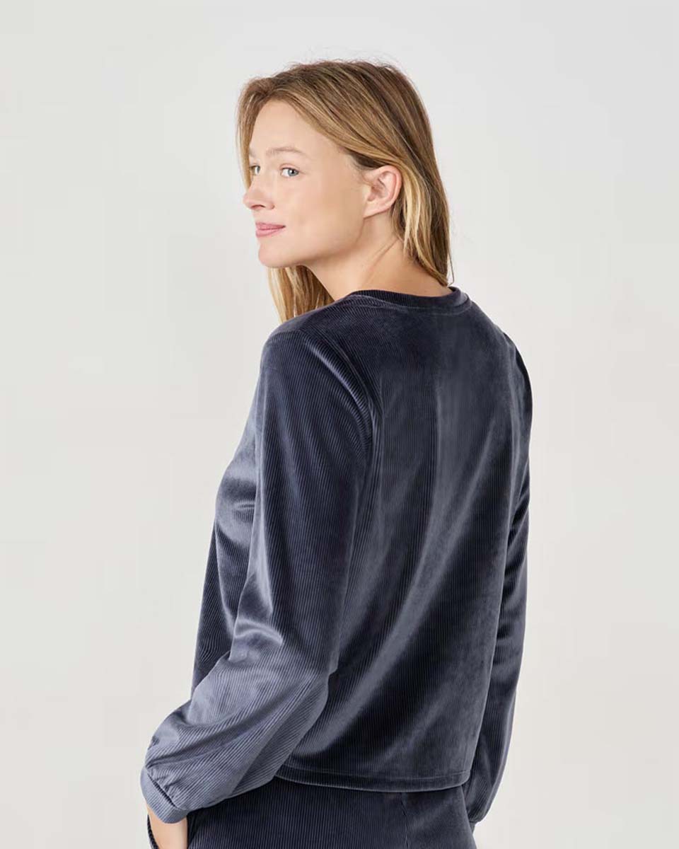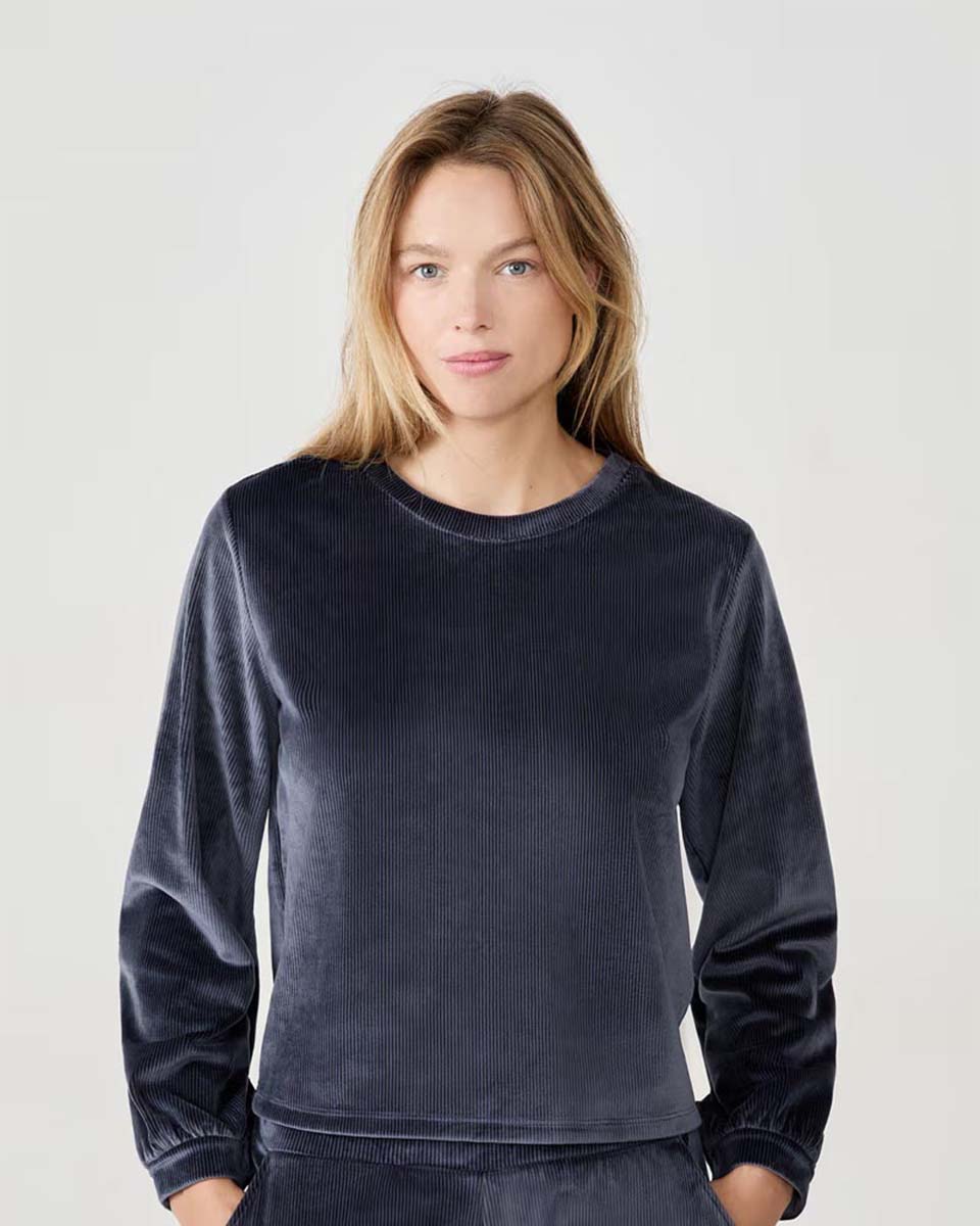 This long-sleeved sweatshirt is reimagined with a velvet effect. Its wide cut is ideal and adds a cosy touch.