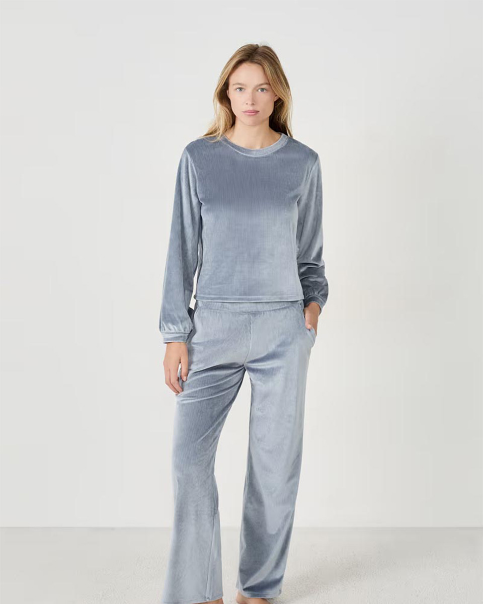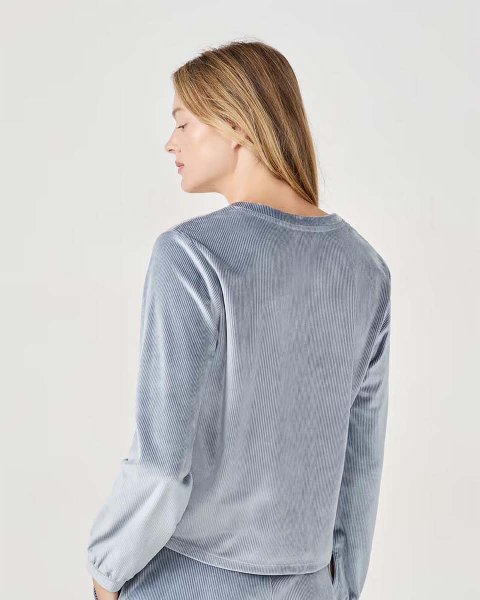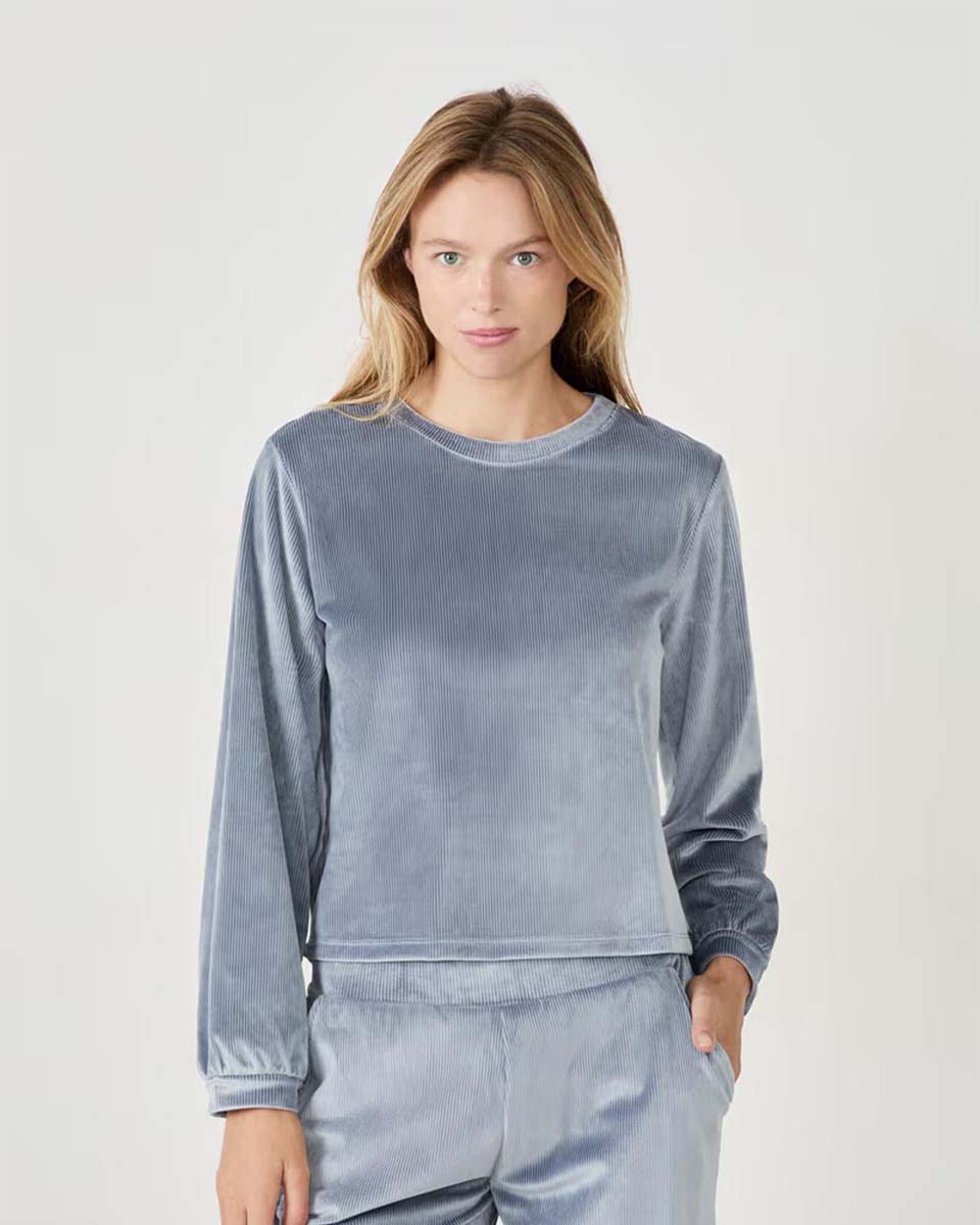 This long-sleeved sweatshirt is reimagined with a velvet effect. Its wide cut is ideal and adds a cosy touch.