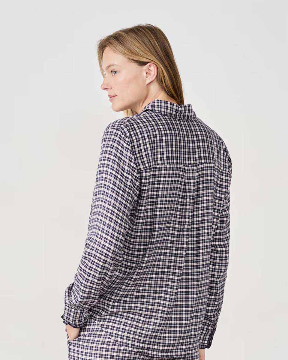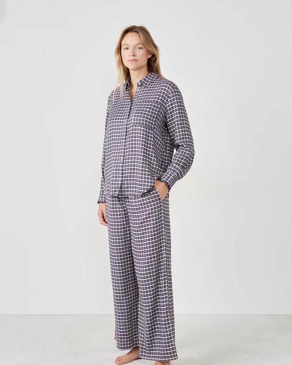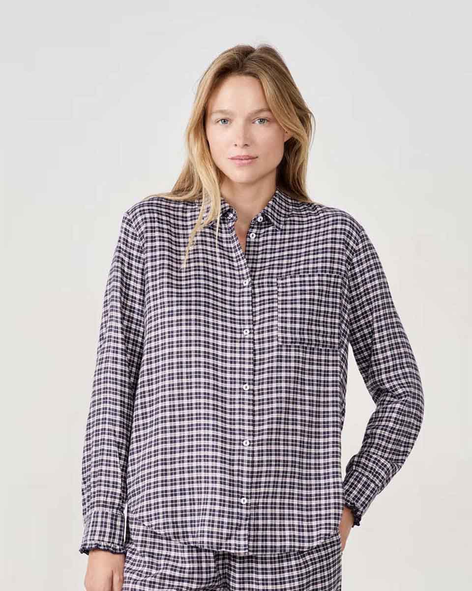 This pyjama shirt is revisited with a small checkered pattern. It pairs with the coordinating trousers.