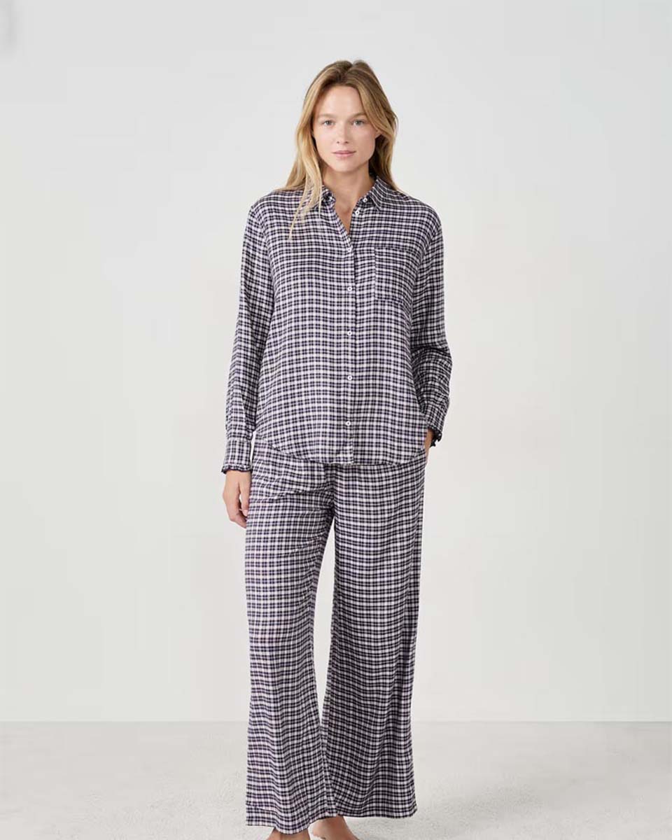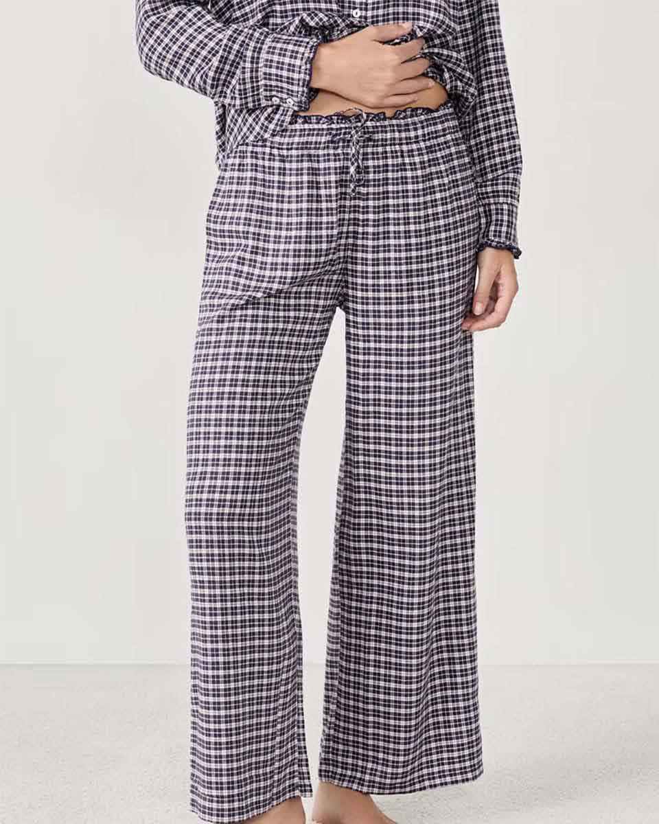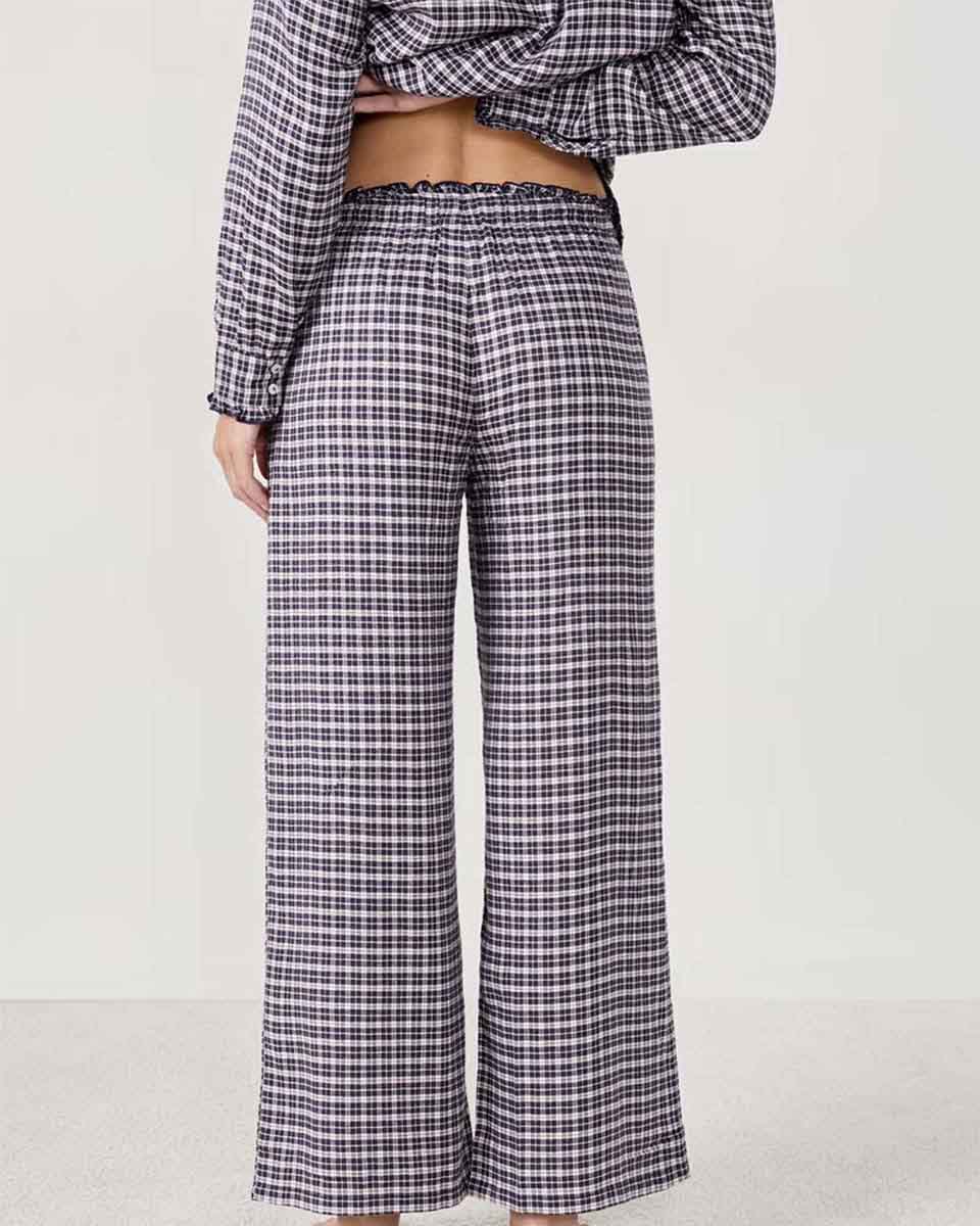 These pyjama trousers are reimagined with a small checkered pattern. They pair with the coordinating shirt