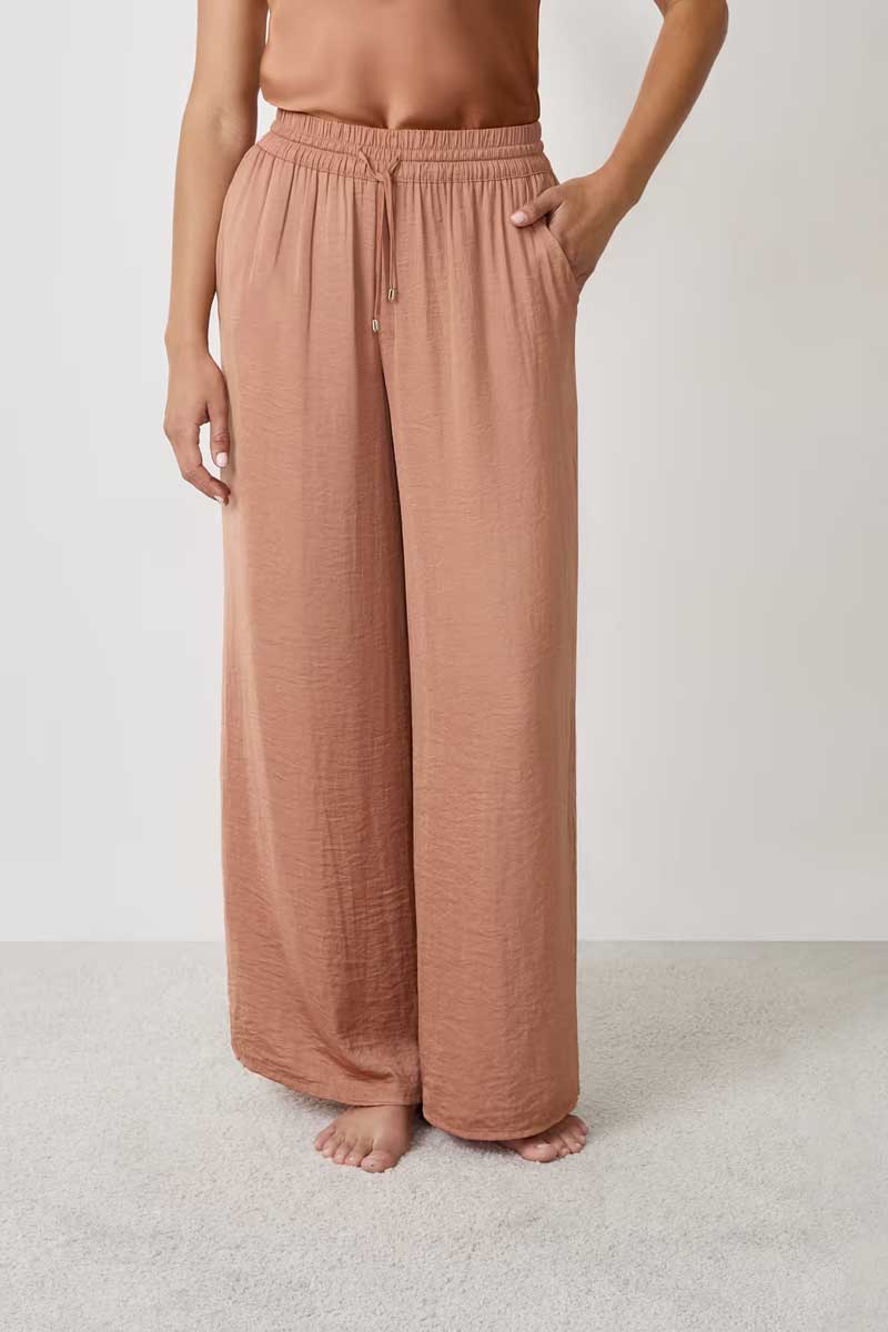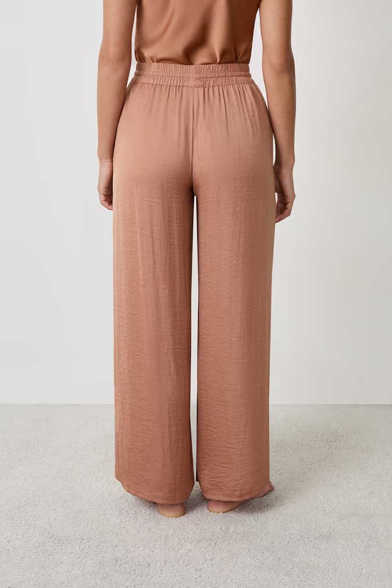 “Delicately satiny, these pants feature drawstrings to tie around the waist and gathers. Their wide cut adds the desired lightness to your silhouette.Pair them with the matching top for a complete look.”