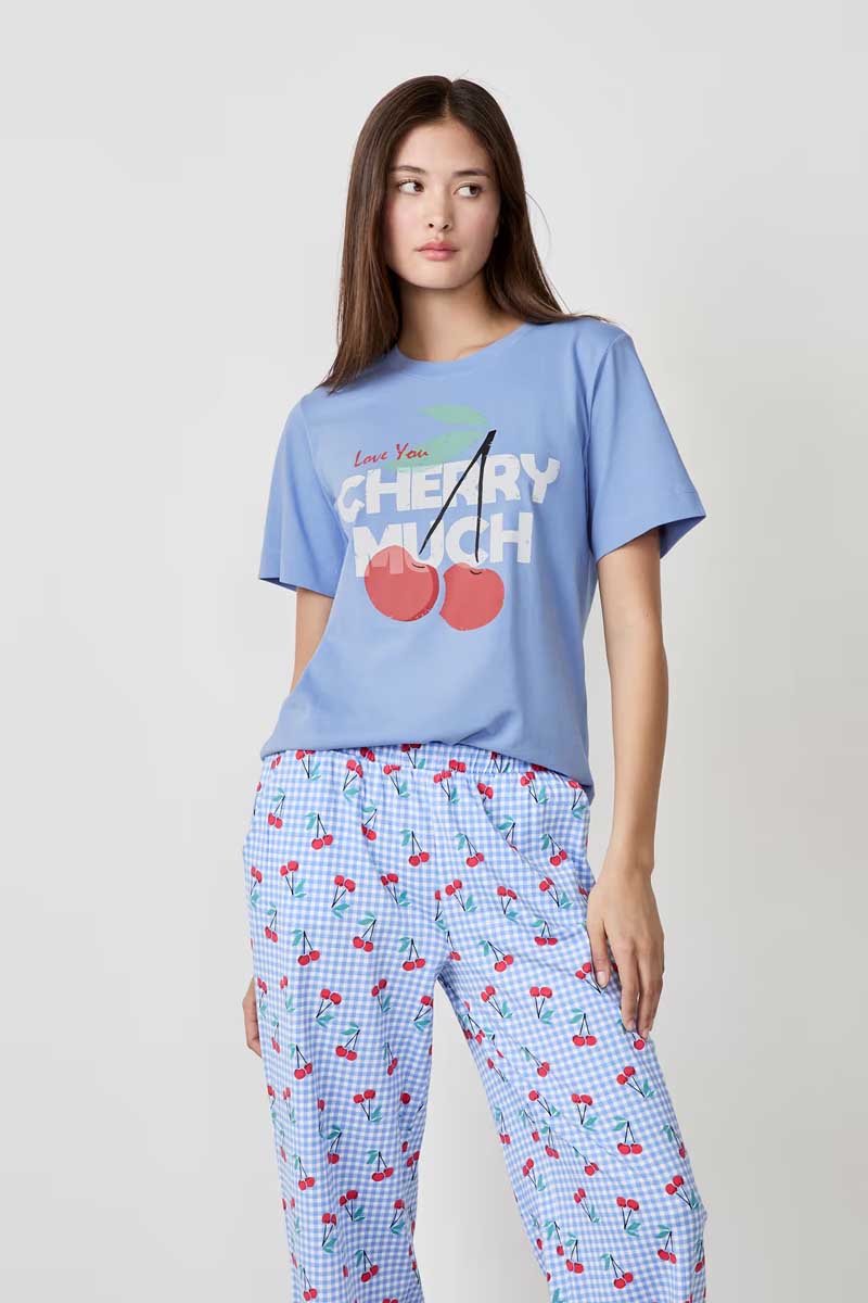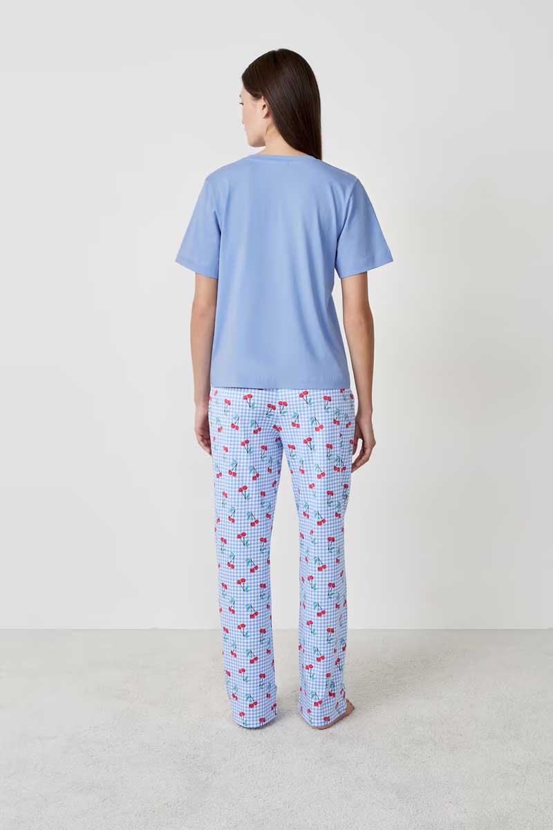 “With this 2-piece set, these cotton pyjamas are perfect for cosy and soft evenings. It consists of a short-sleeved round neck t-shirt and flared trousers, structured with an elastic waistband.Ideal to give as a gift or to treat yourself.”