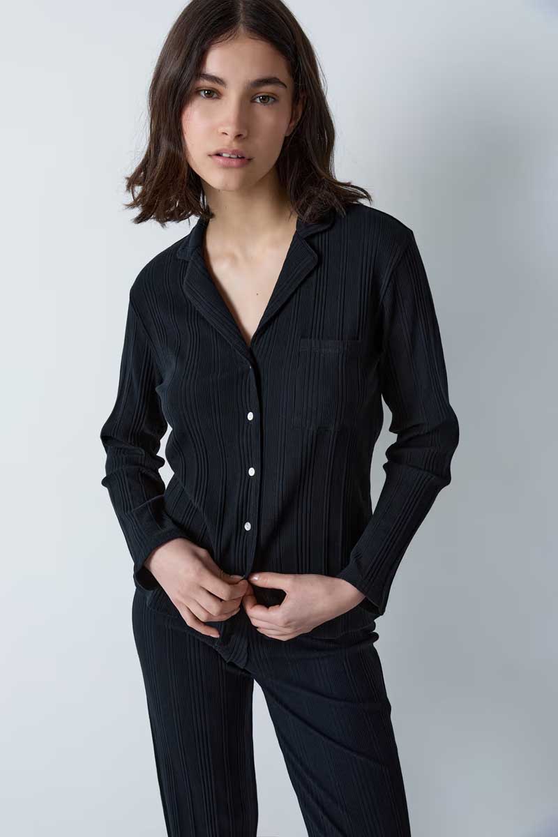 “The Etam studio revisits the essential and timeless pyjama shirt. With long sleeves, it features a shirt collar, a patch pocket and closes with buttons.”