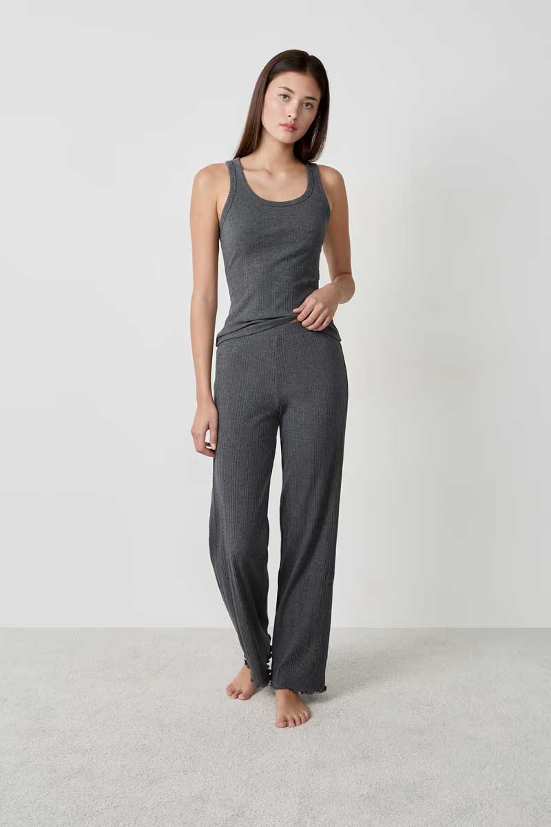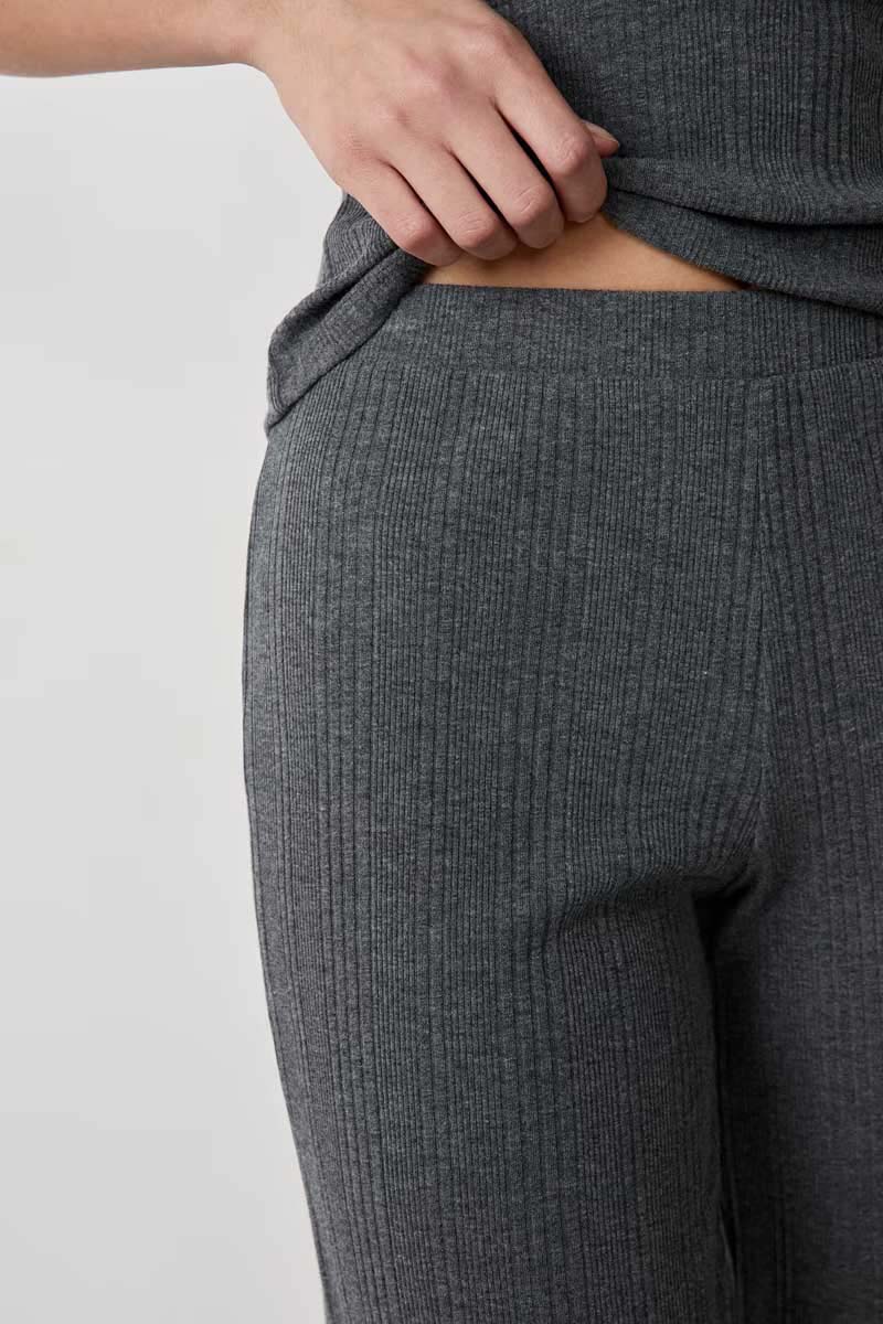 “Featuring an elastic waistband, these trousers gently hug the curves and reveal a straight flared cut. They create an elegant silhouette.”