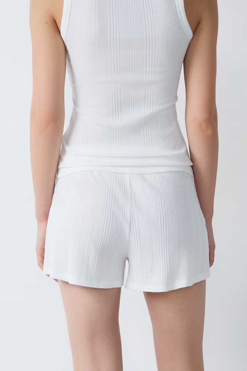 A soft and delicately ribbed material for nights full of comfort.These shorts with an elasticated waist coordinate with the matching vest top.