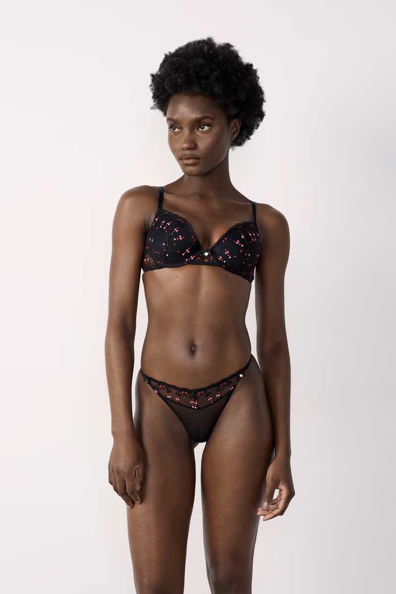 Celebrate love with this bra decorated with little embroidered hearts. Push-up cups offer additional size to the neckline, and a small heart charm appears at the cleavage.