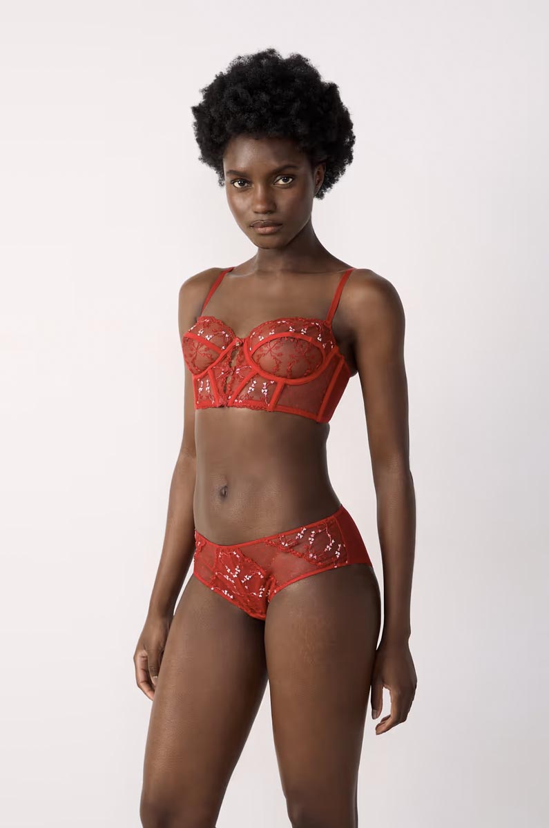 A sensual and favorite piece. This strapless bra constructed without cups and with underwire highlights the neckline and displays transparent tulle embroidered with flowers. Delicately openwork at the cleavage, it displays small satin bows and a heart charm.