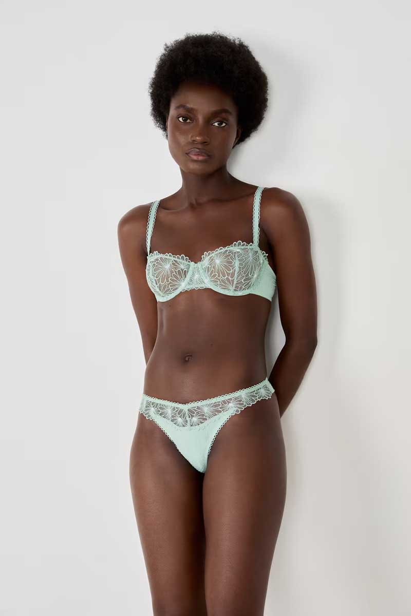 “This thong features trompe-l’oeil floral embroidery for a delicate look. It subtly plays between transparency and opacity, and features a subtle openwork opening at the back.”