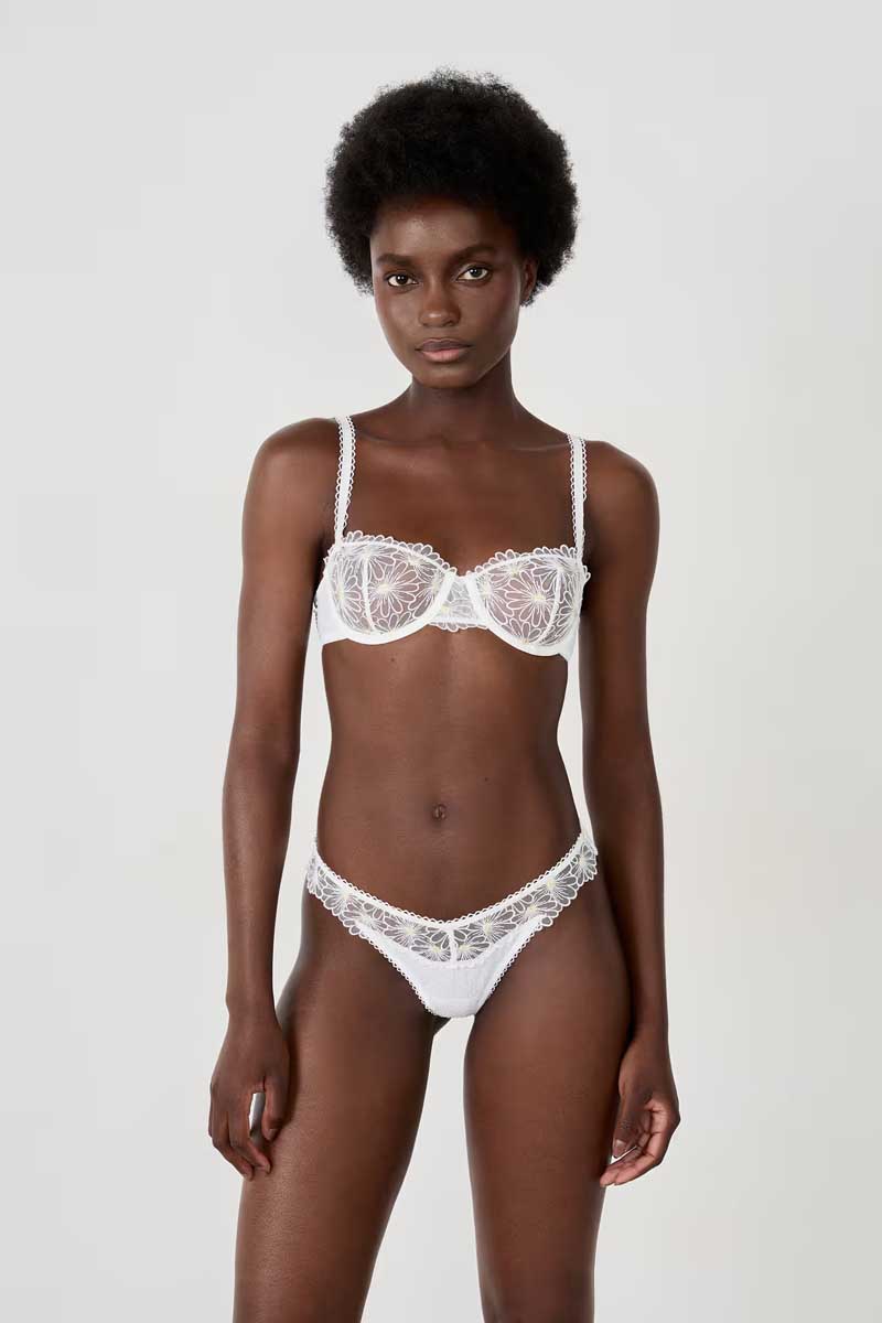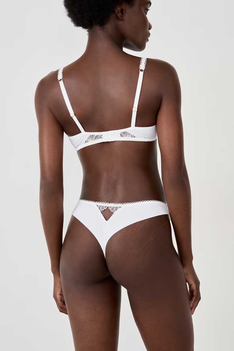 “This thong features trompe-l’oeil floral embroidery for a delicate look. It subtly plays between transparency and opacity, and features a subtle openwork opening at the back.”