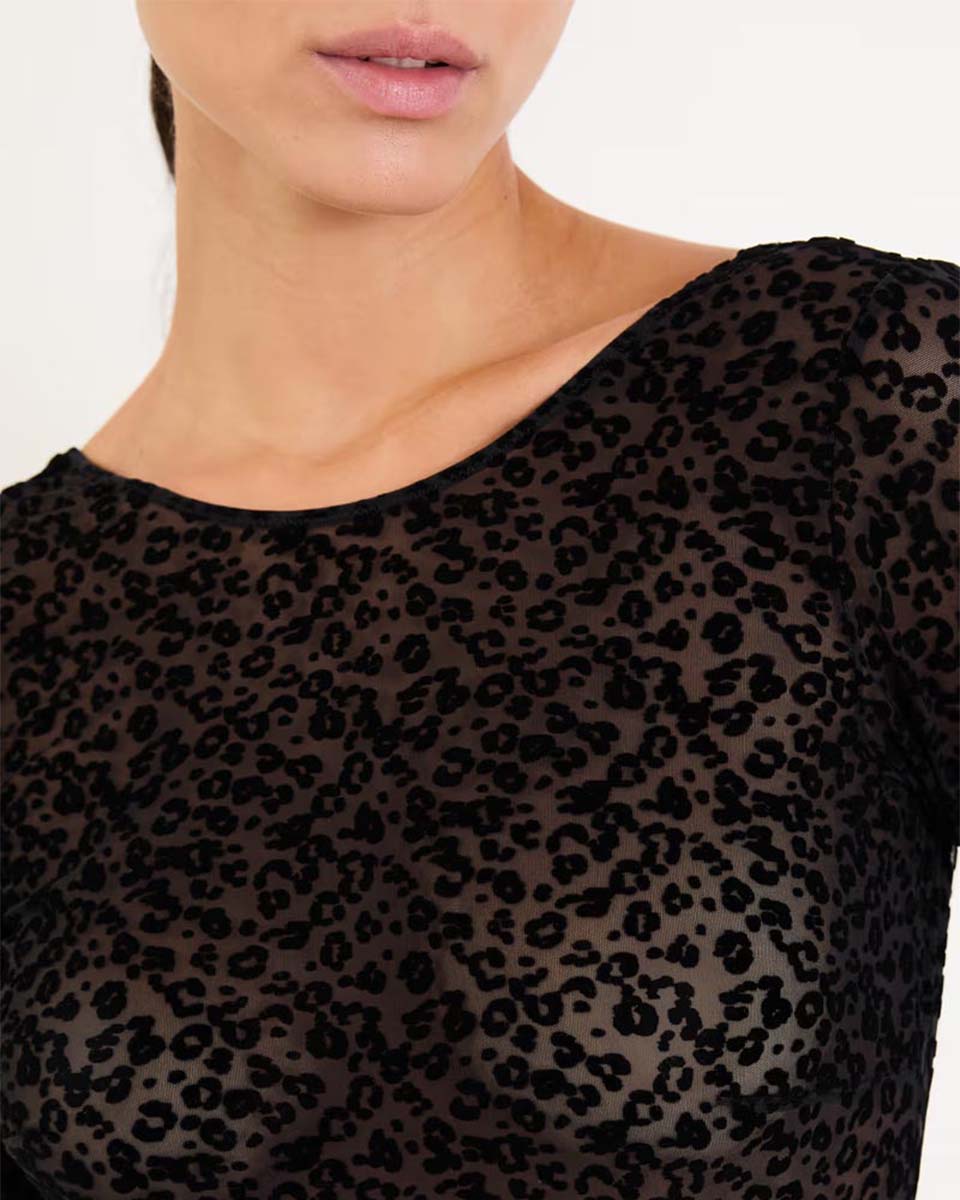 This bodysuit is dressed in a leopard print velvet. It plays with transparency and reveals a bare back.
