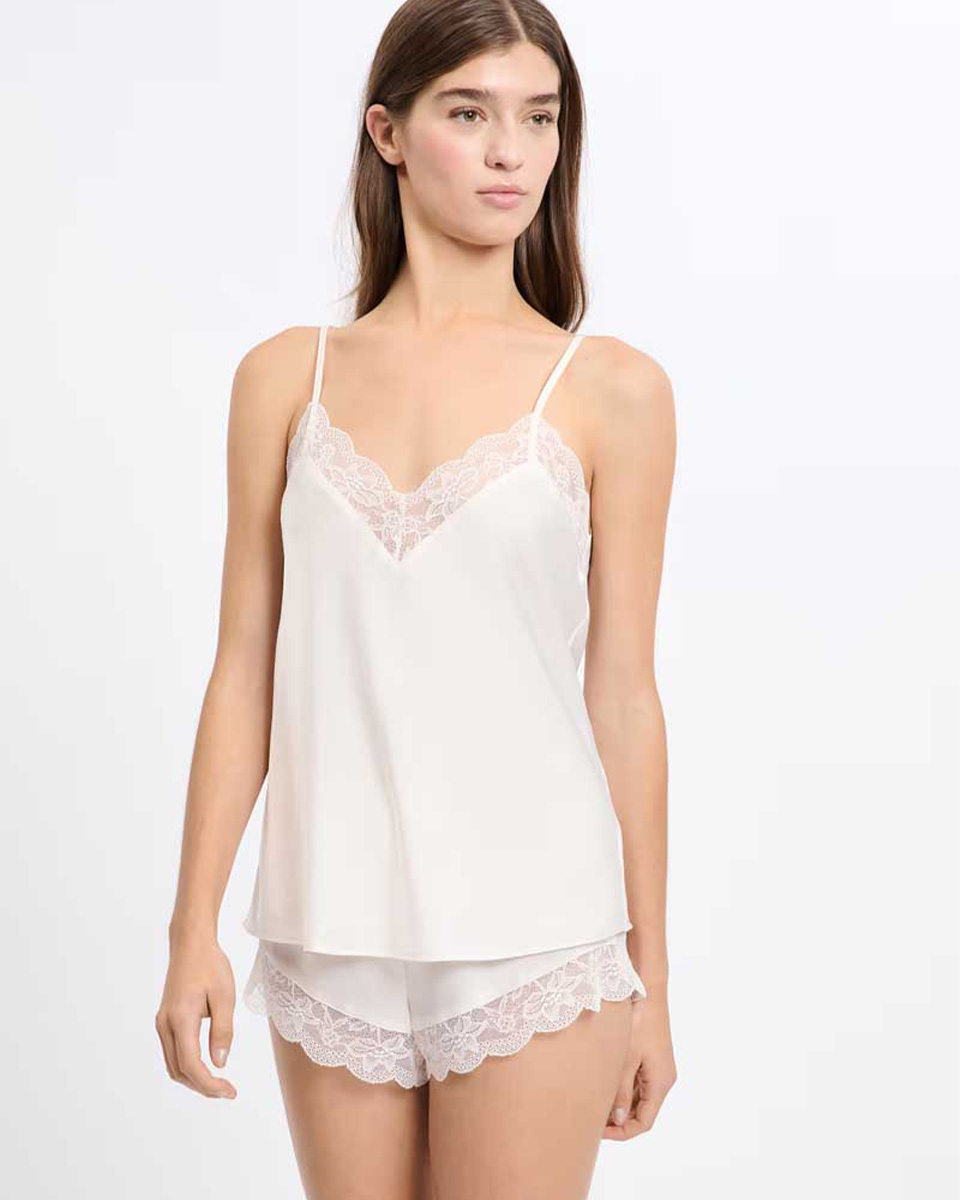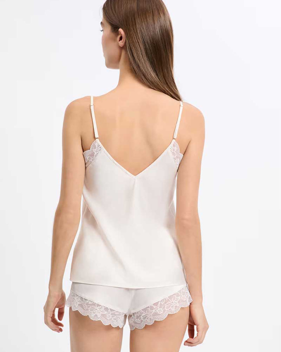 “Light and elegant, this camisole is trimmed with lace. Featuring thin straps and a V-neck, it offers a satin finish and a flowing cut.”