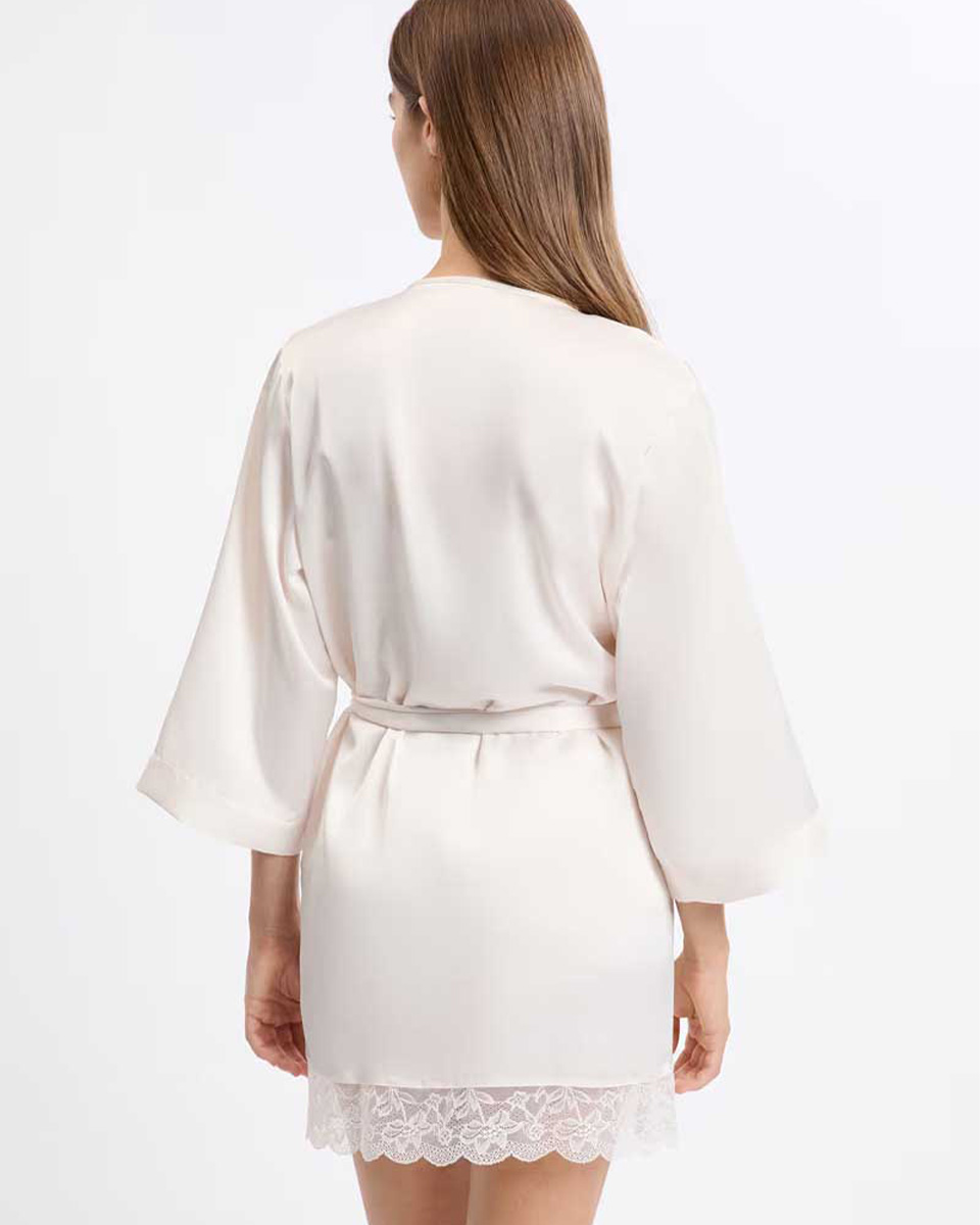“This satin negligee is distinguished by its delicate lace drape. Elegant and refined, it ties at the waist to create a structured and sophisticated silhouette.”