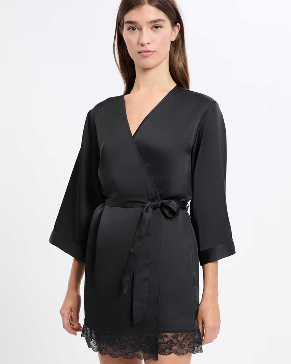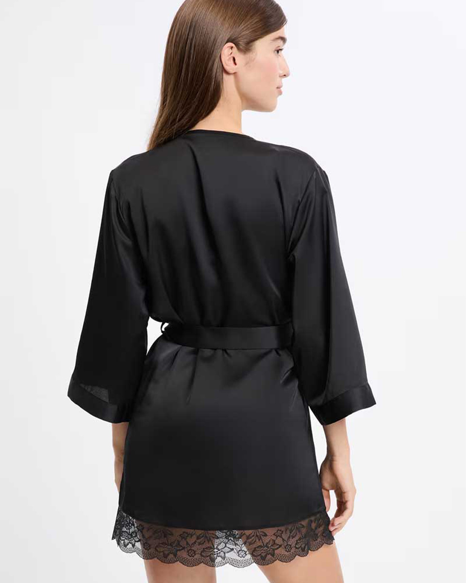 “This robe in satin material is distinguished by its lace trim. Elegant and refined, it ties at the waist to create a structured and sophisticated silhouette.”