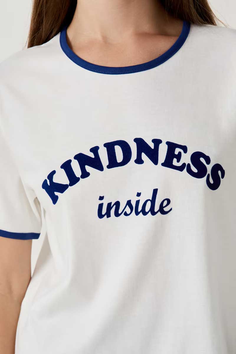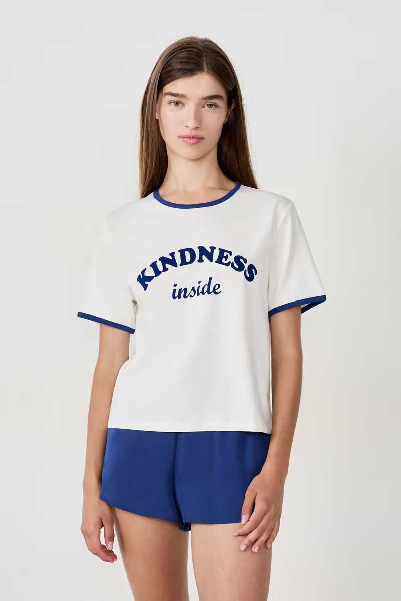 “Perfect for light, cozy nights, this short-sleeved t-shirt is made from cotton. Featuring a crew neck and a print on the chest, it’s a classic with a twist, featuring contrasting trim on the collar and sleeves.”
