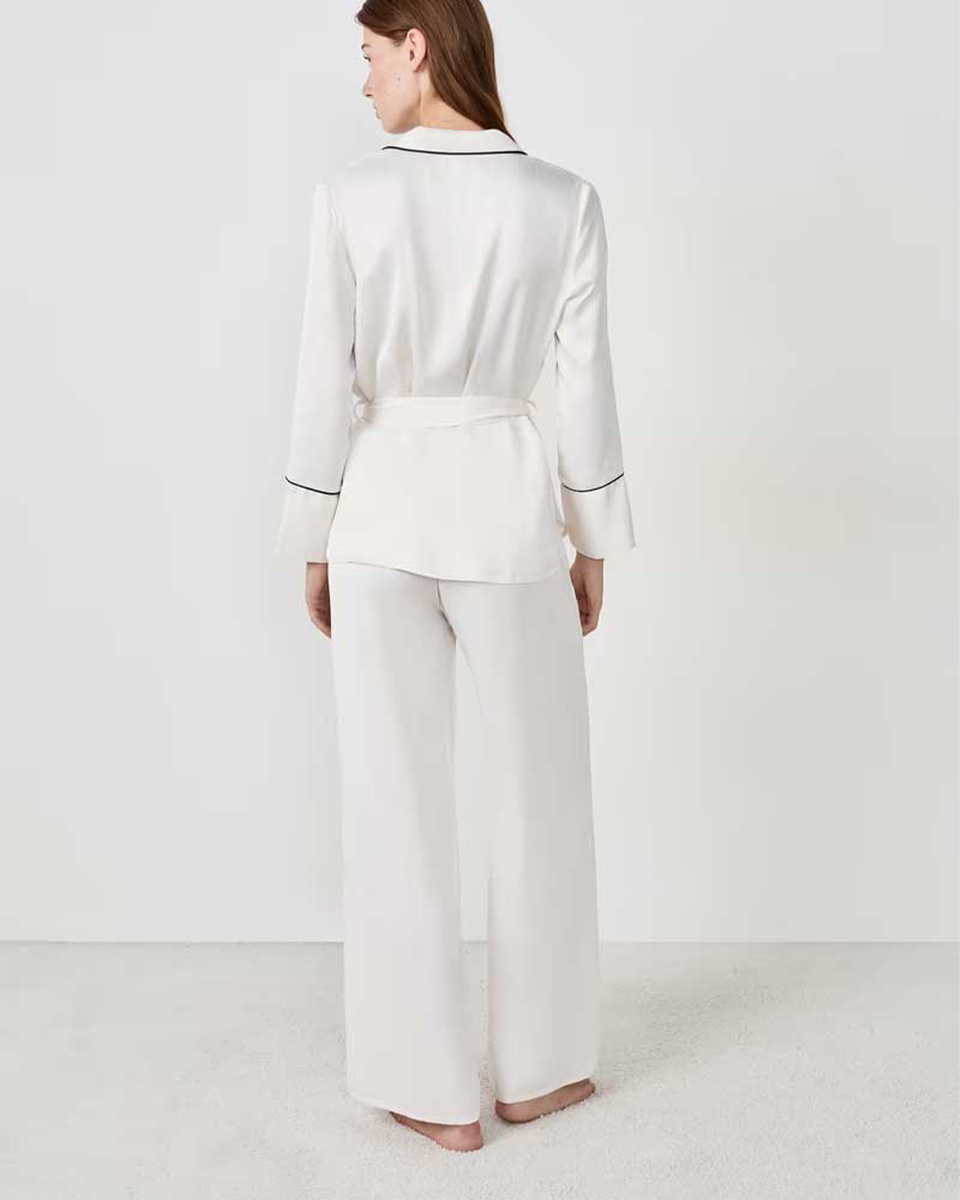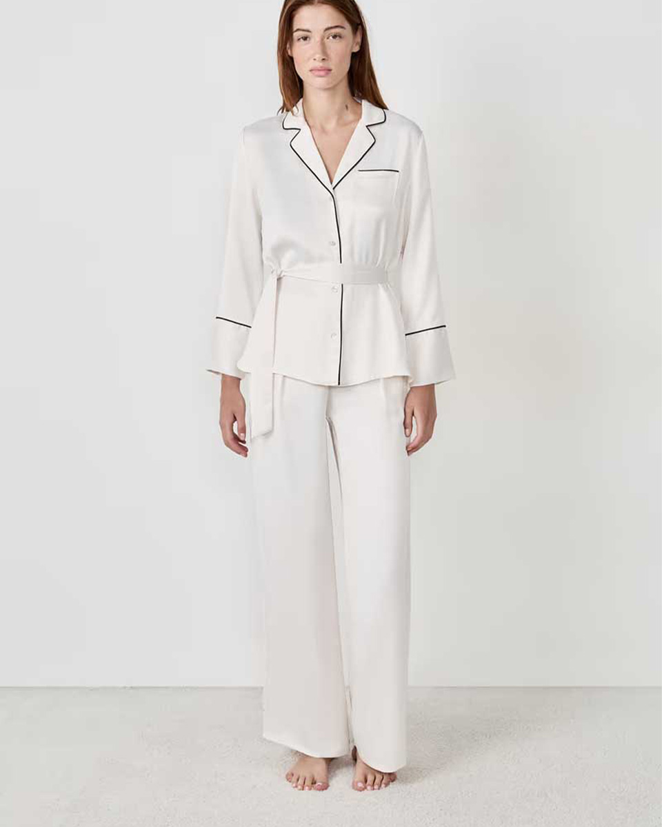 Elegance and delicacy… This satin shirt features a patch pocket and closes with buttons. It ties at the waist to subtly shape the silhouette.
