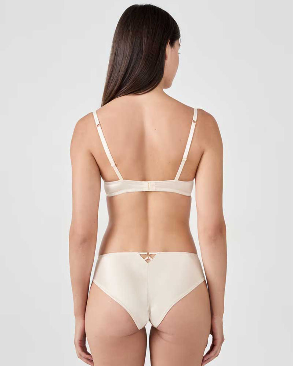 “This bra features delicate embroidery and a slightly sequined scalloped edge. With push-up cups and underwires, it shapes the bust and reveals a plunging neckline. It is enhanced by a double ring detail on the strap.”