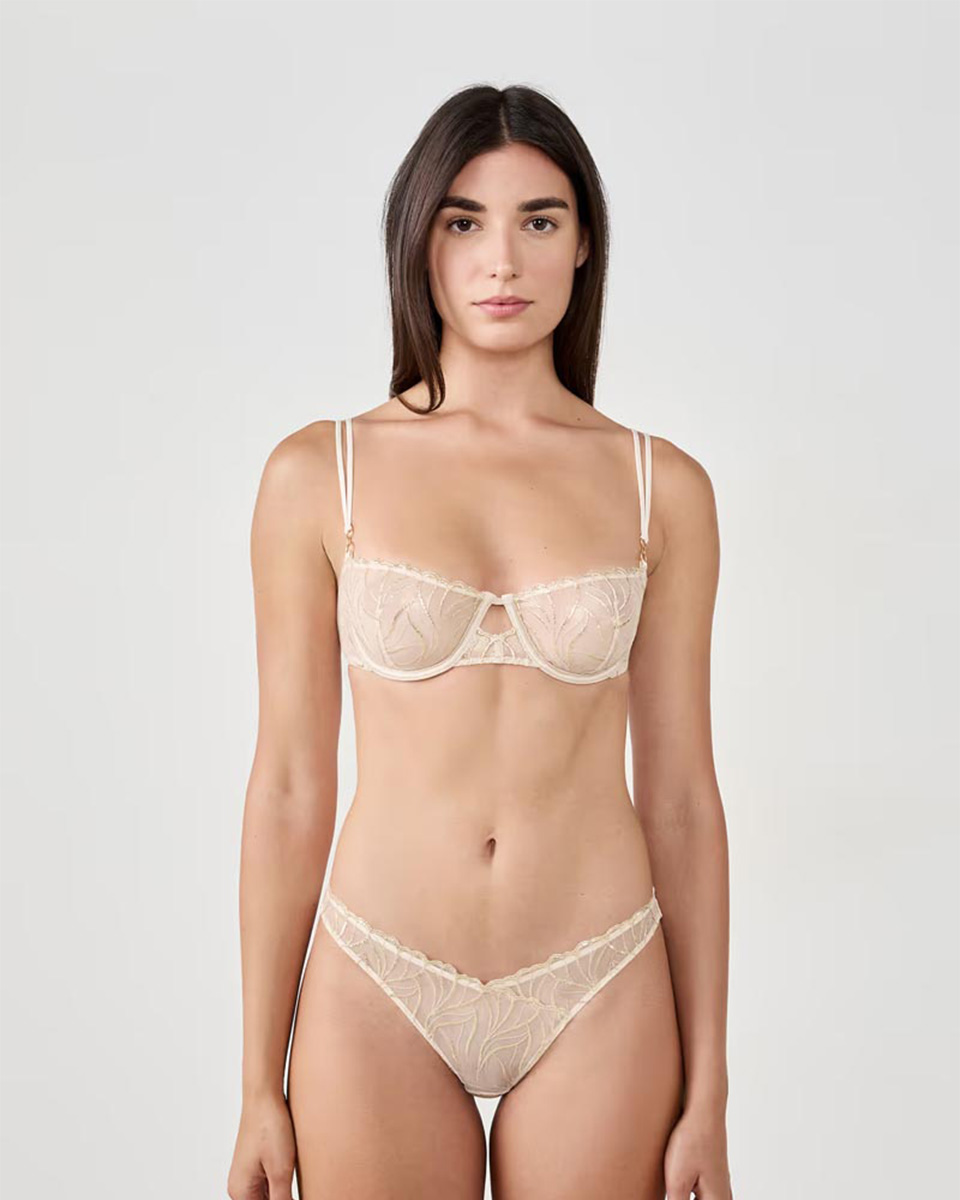 This tanga in tulle and satin microfiber features delicate embroidery and a slightly glittery scalloped edge.