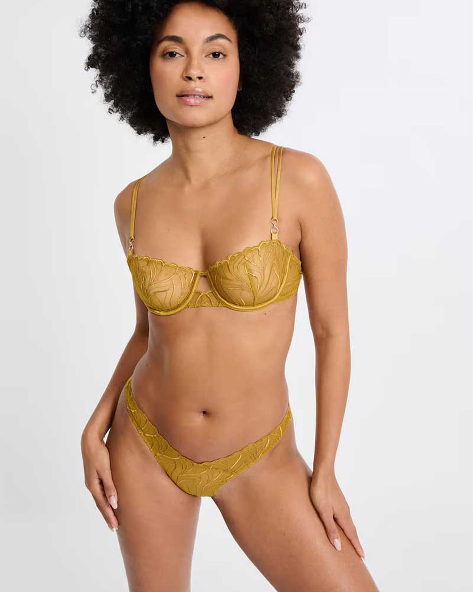 This thong in tulle and satin microfiber features delicate embroidery and a slightly glittery scalloped edge.