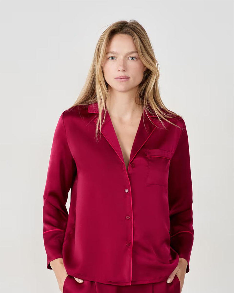 “Elegant and refined, this long-sleeved satin pyjama shirt is enhanced with contrasting piping. It offers a fluid cut for soft and light nights.”