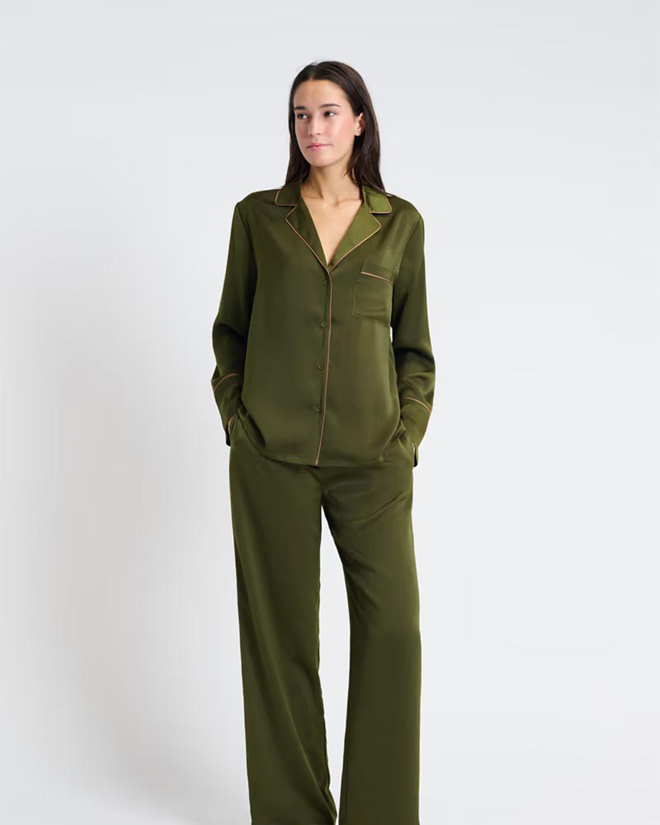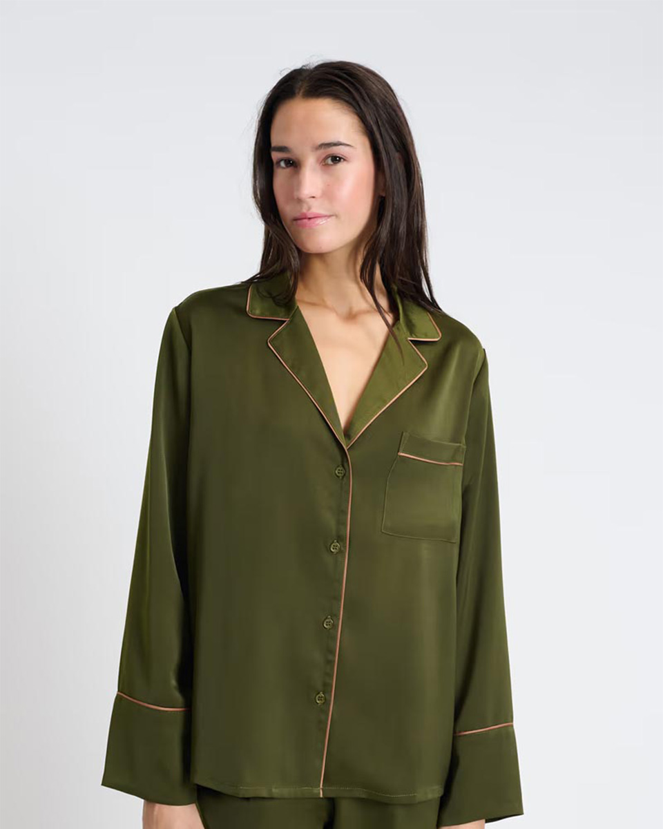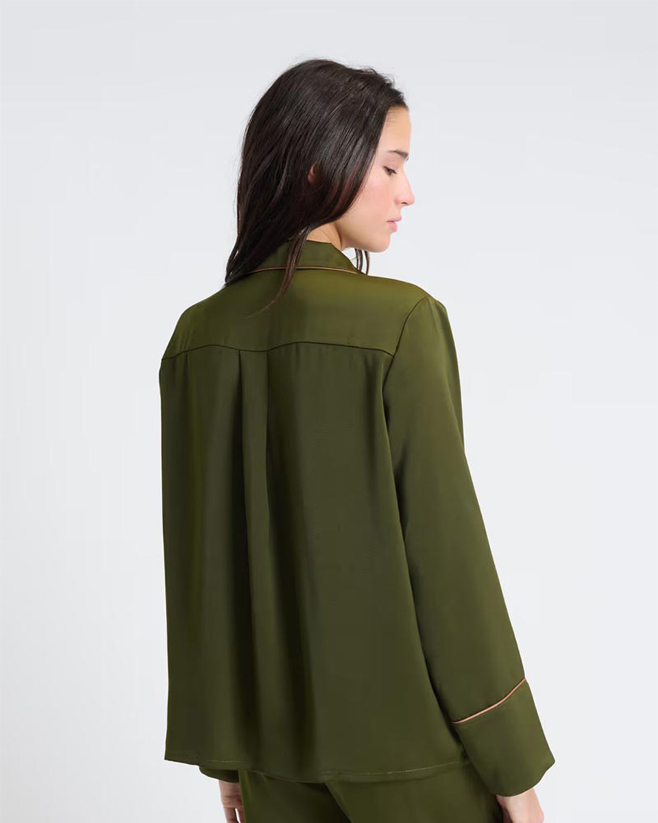 “Elegant and refined, this long-sleeved satin pyjama shirt is enhanced with contrasting piping. It offers a fluid cut for soft and light nights.”