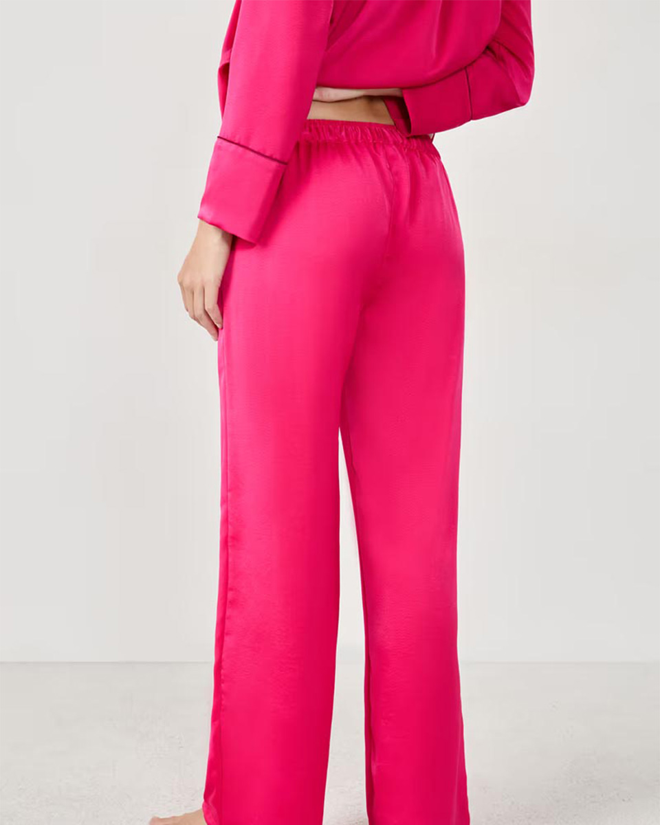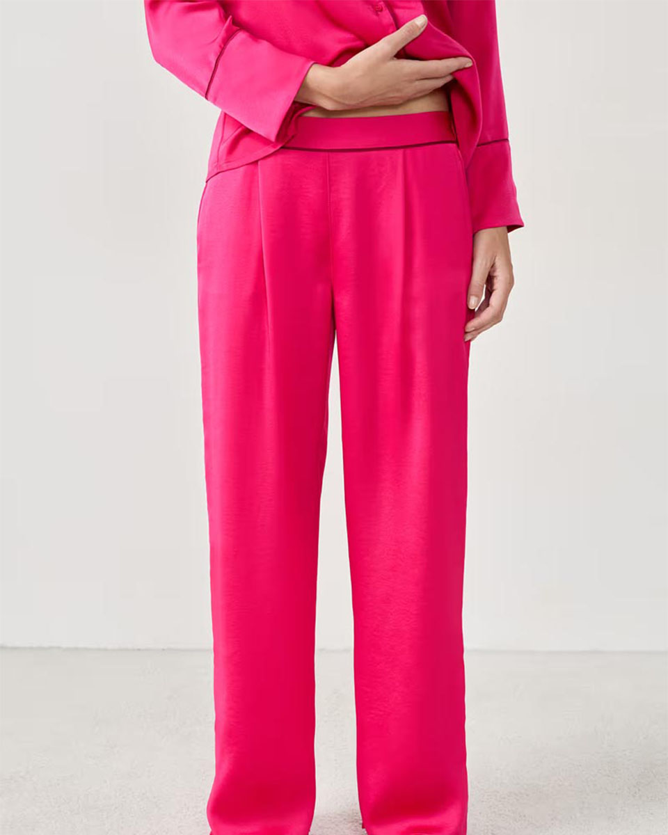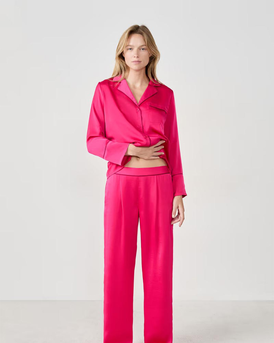 “Elegant and refined, these satin pyjamas are enhanced with contrasting piping. They offer a fluid cut for soft and light nights.”