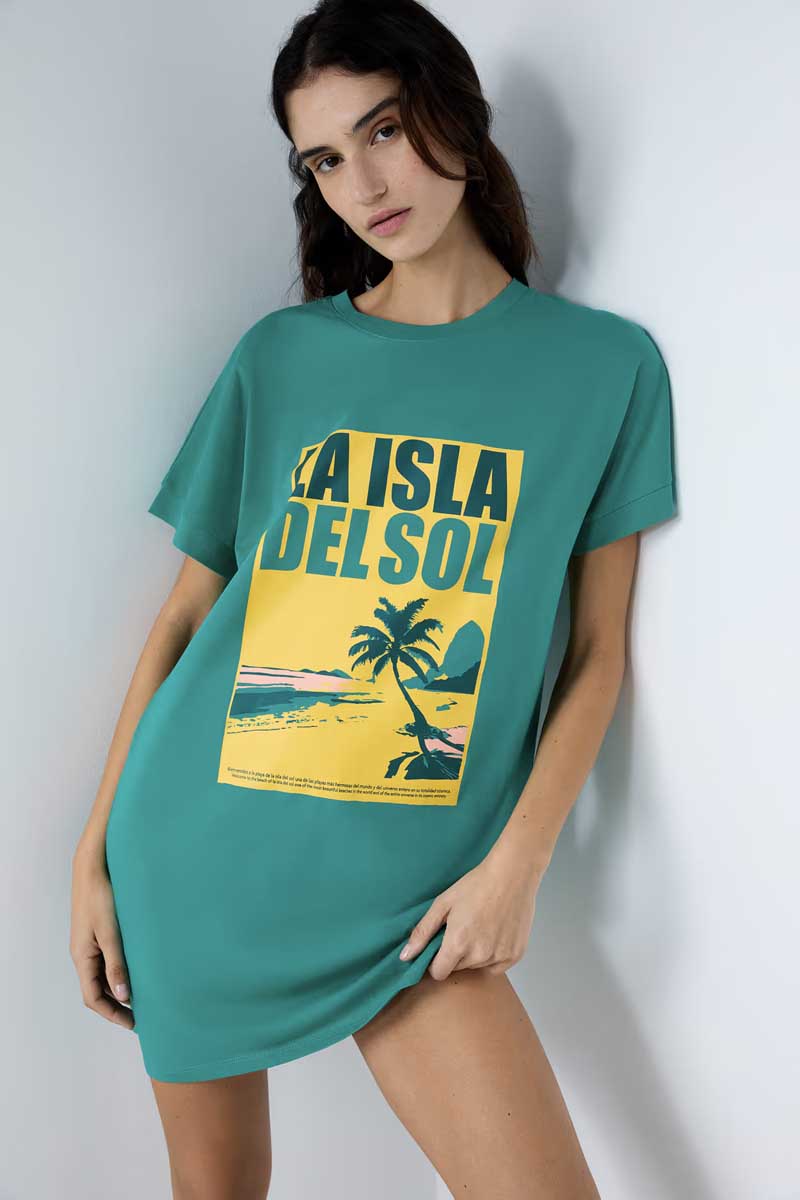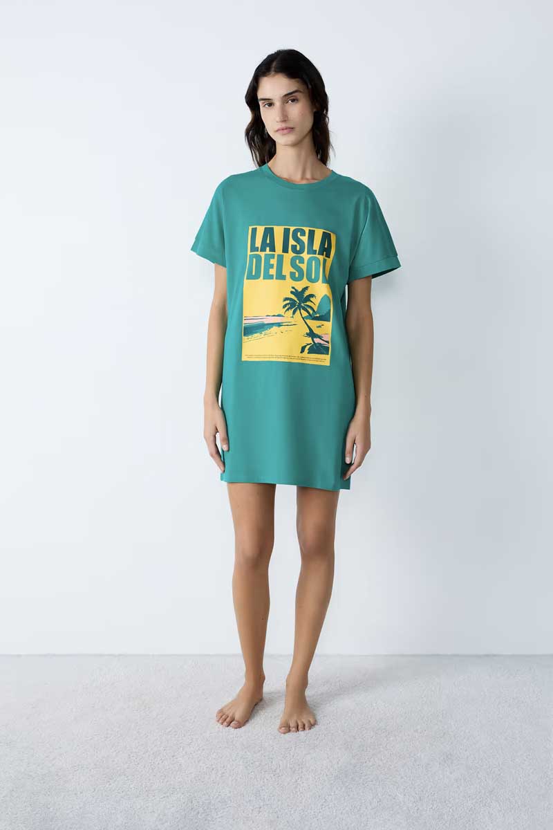 “Featuring a print inspired by tropical landscapes, this essential cotton nightshirt brings lightness for evenings filled with softness.”