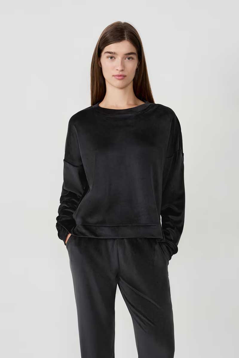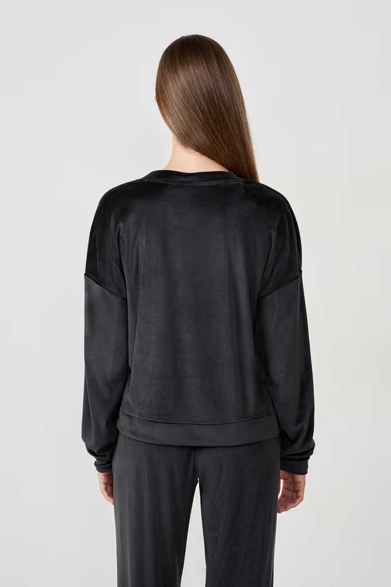 “Ideal for loungewear, this pajama sweatshirt features long sleeves and a crew neck. Its velvet effect and loose fit ensure comfort and support every day.”