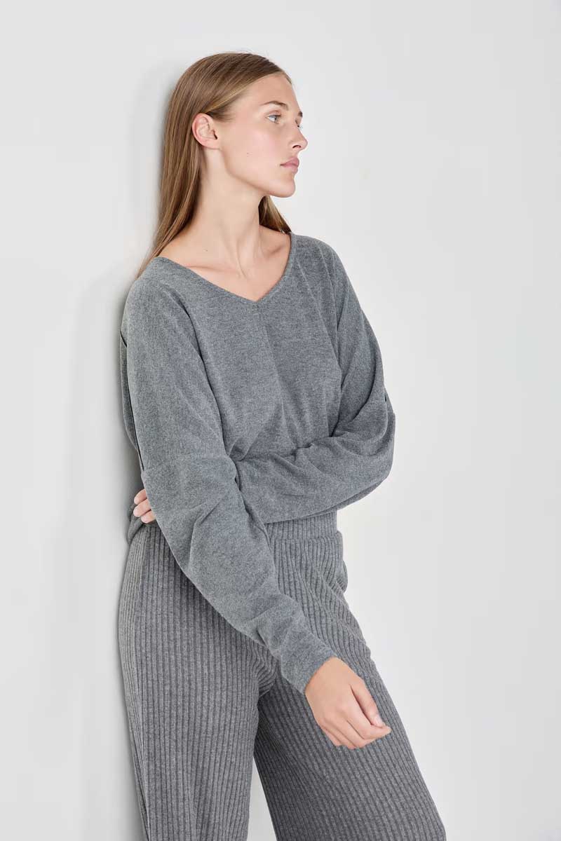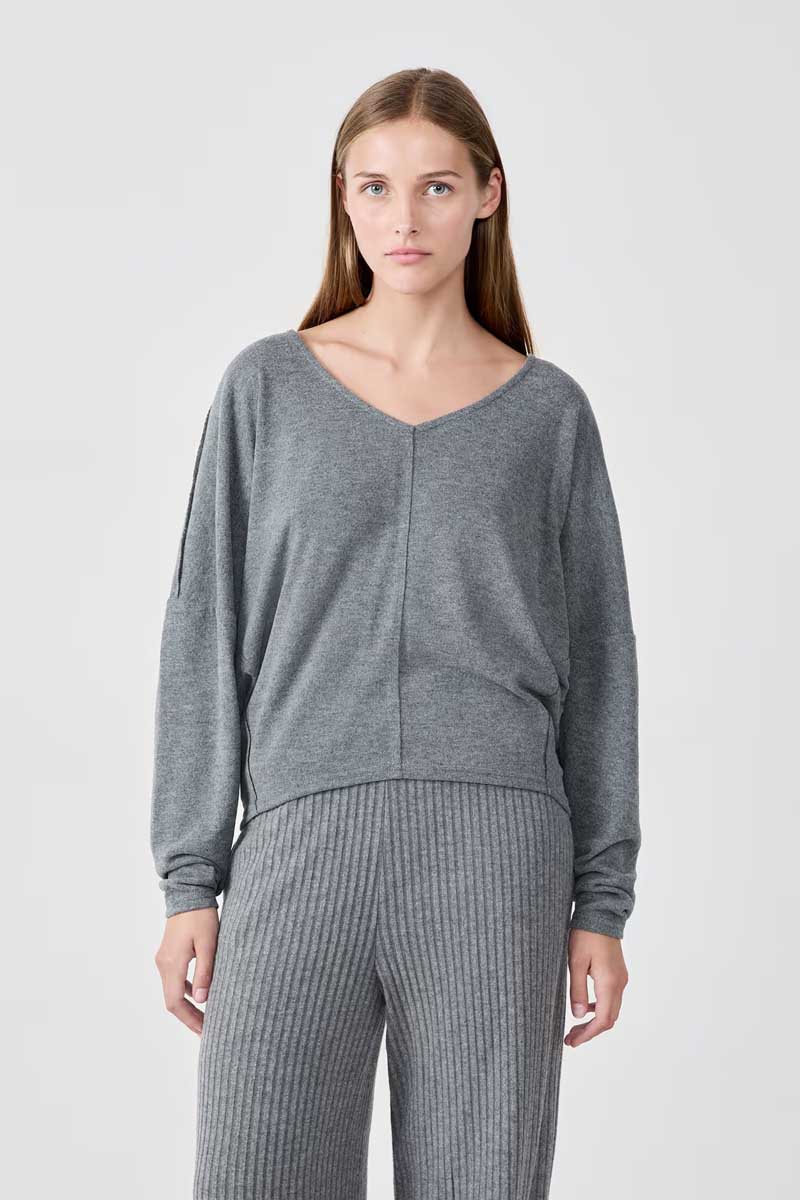 “A wardrobe essential, this soft knit sweater features a V-neck and long sleeves. It stands out with its visible seams down the middle and on the sleeves.”