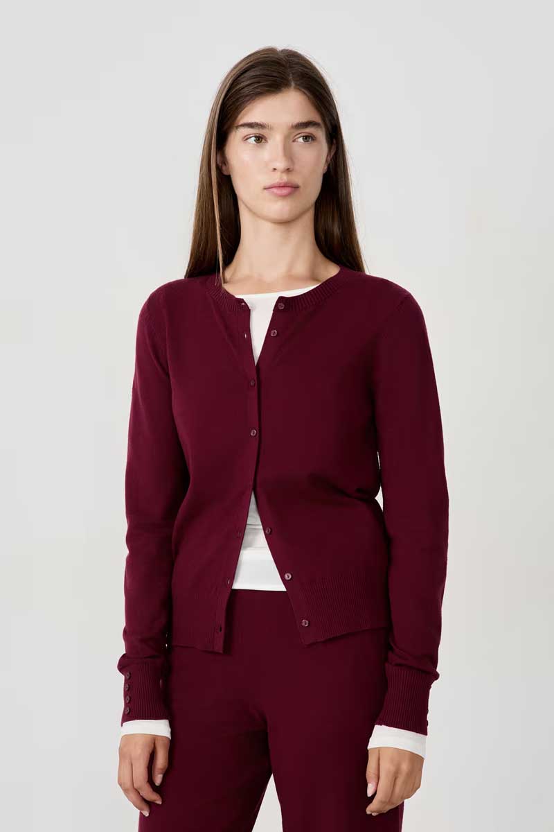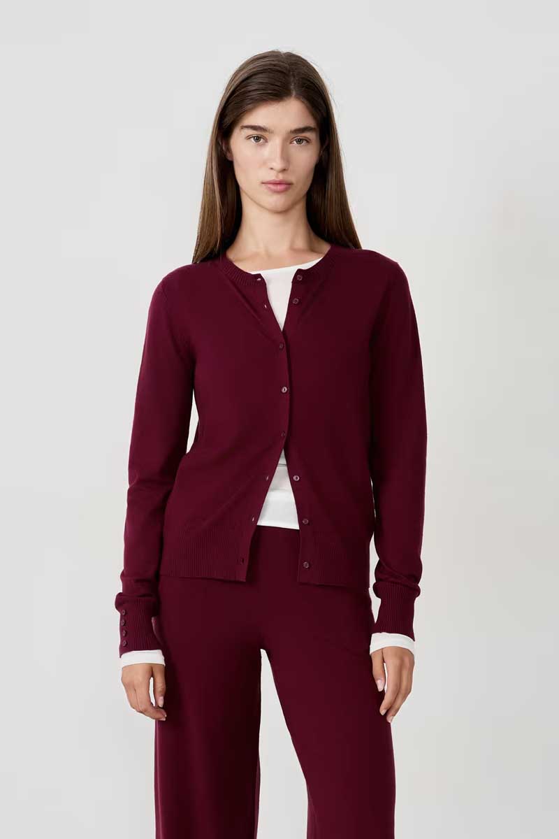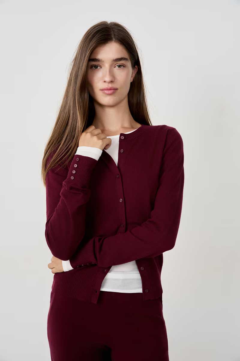 “A wardrobe essential, this long-sleeved cardigan is a must-have basic. It’s given a twist with details on the sleeves. Wear it alone or layered.”