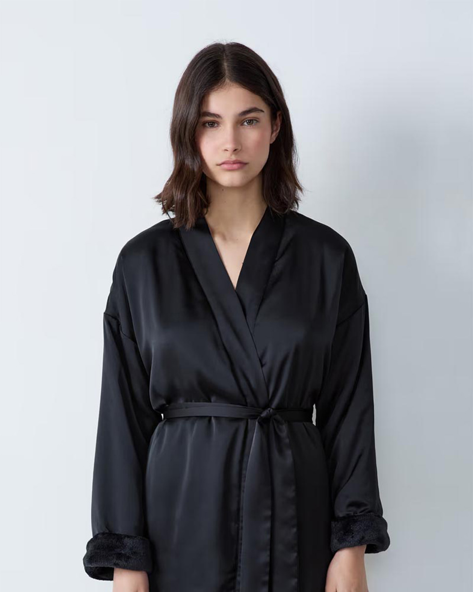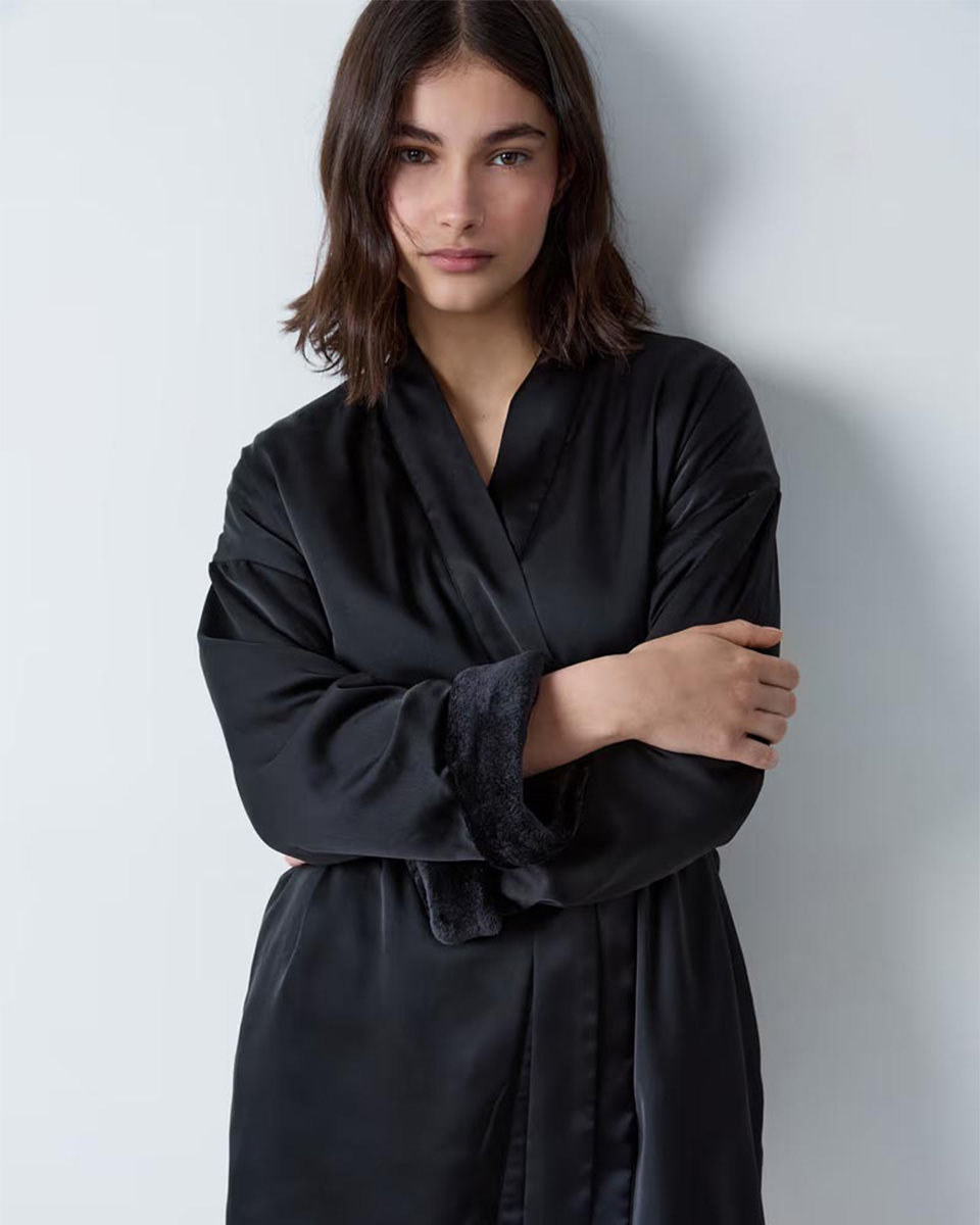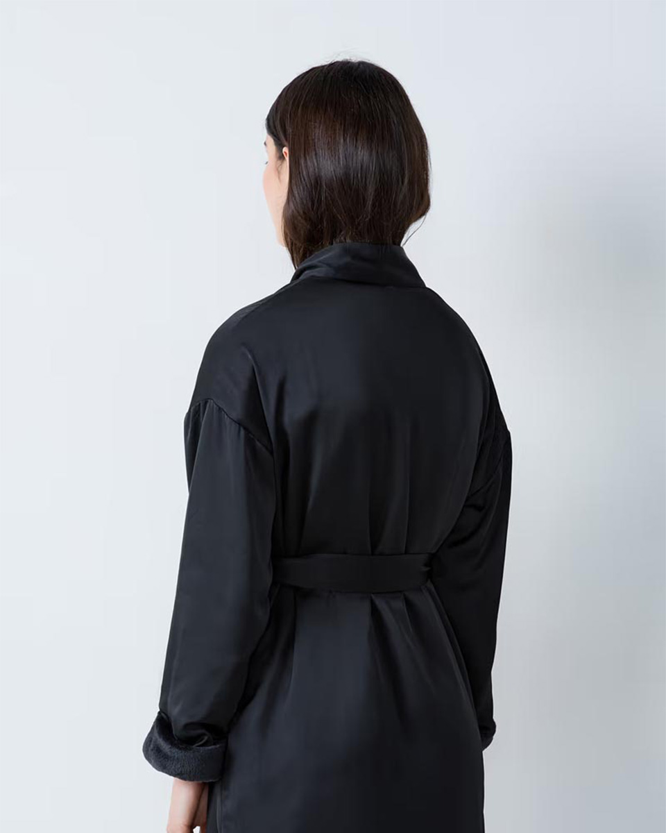“Delicately satin-finished, this chic robe hides a fleece lining… for cosy and warm elegance.”