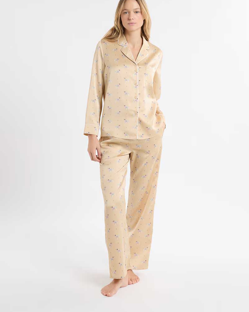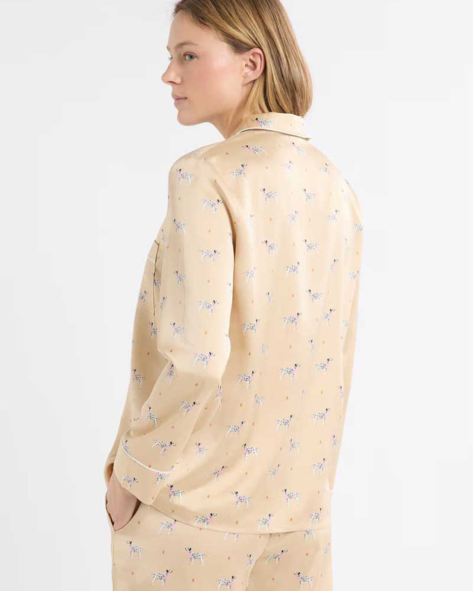 “This pyjama shirt features a dog print. It has long sleeves, a button closure and a patch pocket. It pairs with the matching trousers.”