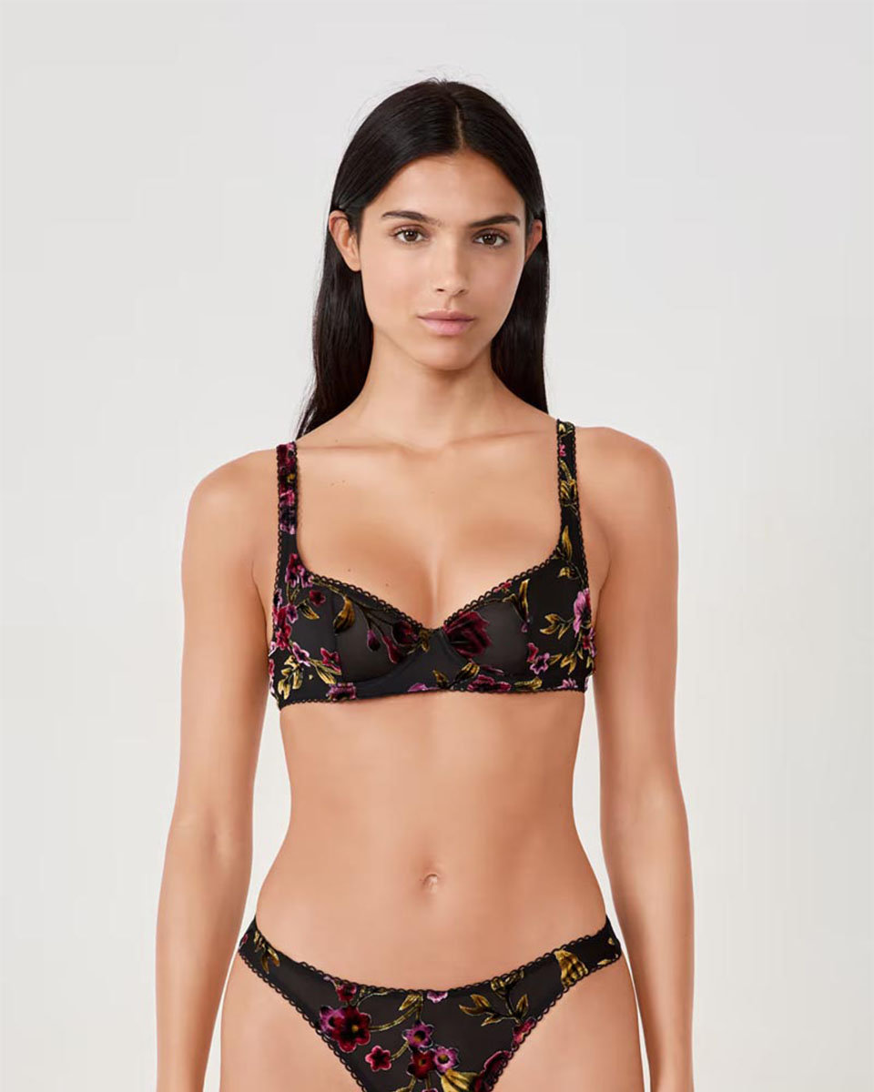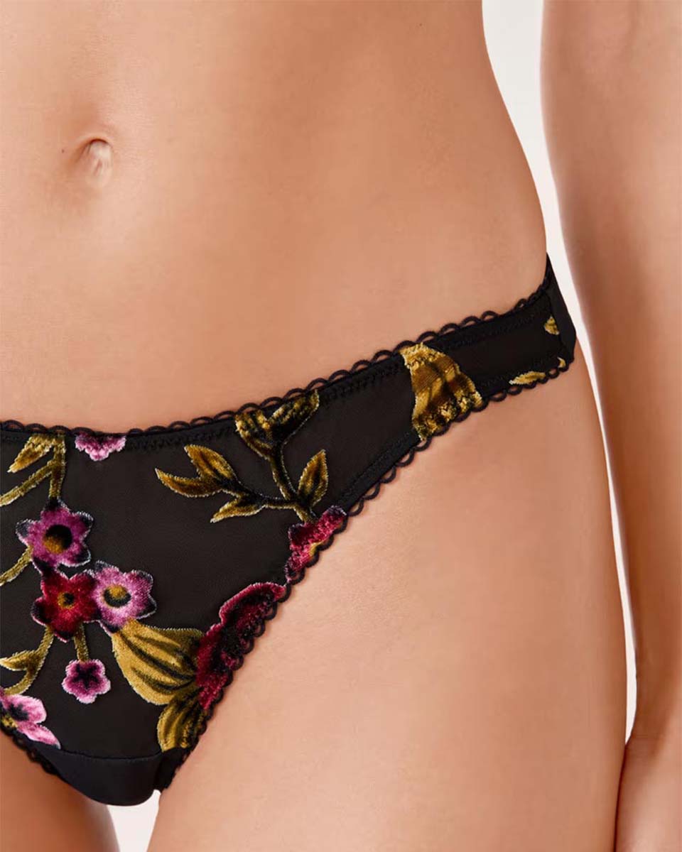 “Ideal for a refined and elegant look, this tanga features a floral print and scalloped edges.”