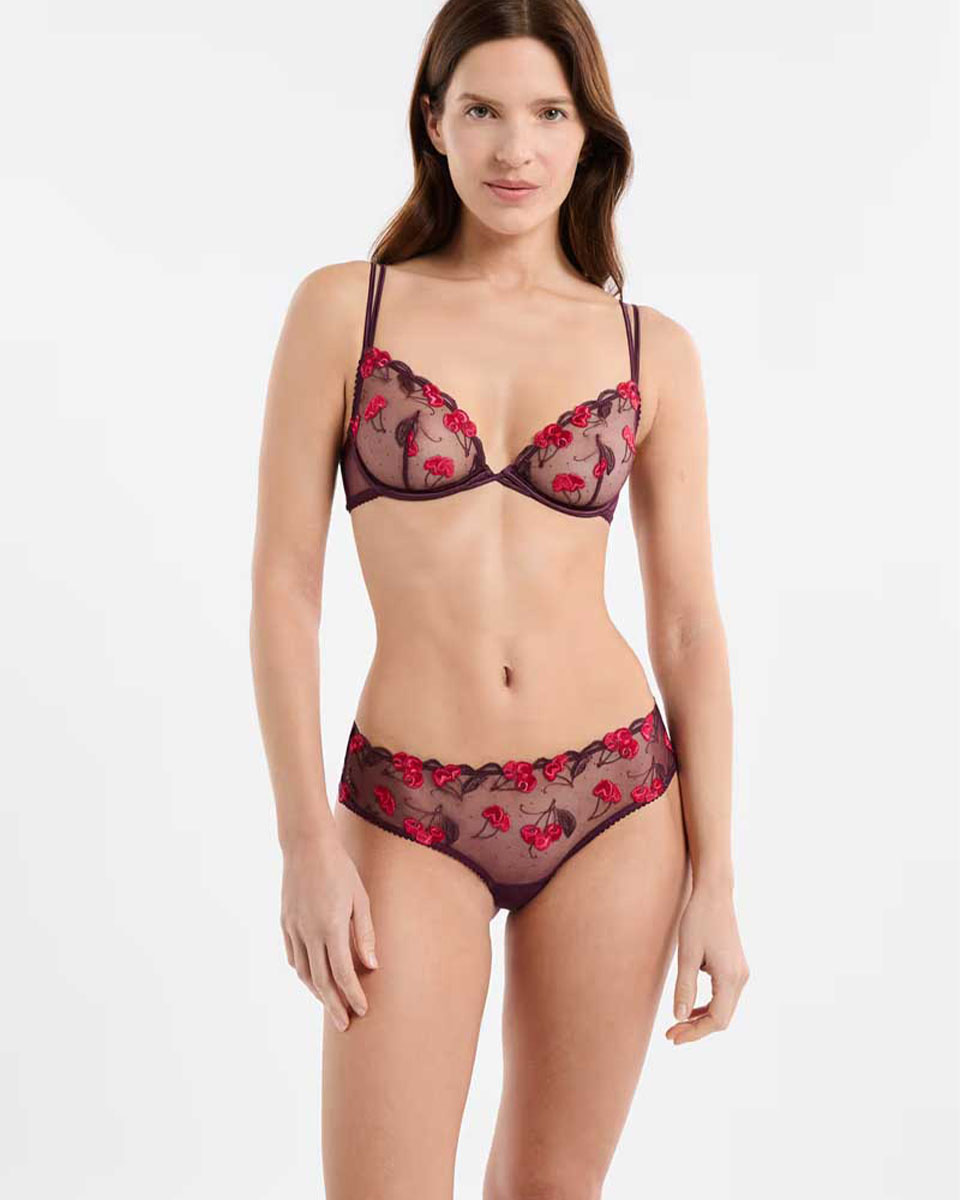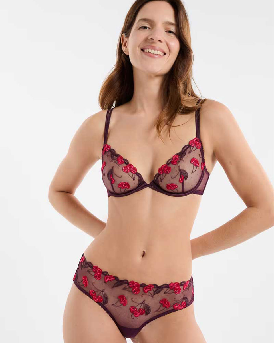 “This bra made from tulle plays with transparency. It is enhanced with delicate cherry-shaped embroidery. Fitted with double straps and underwires, it naturally shapes the bust.”