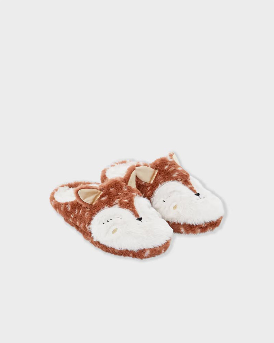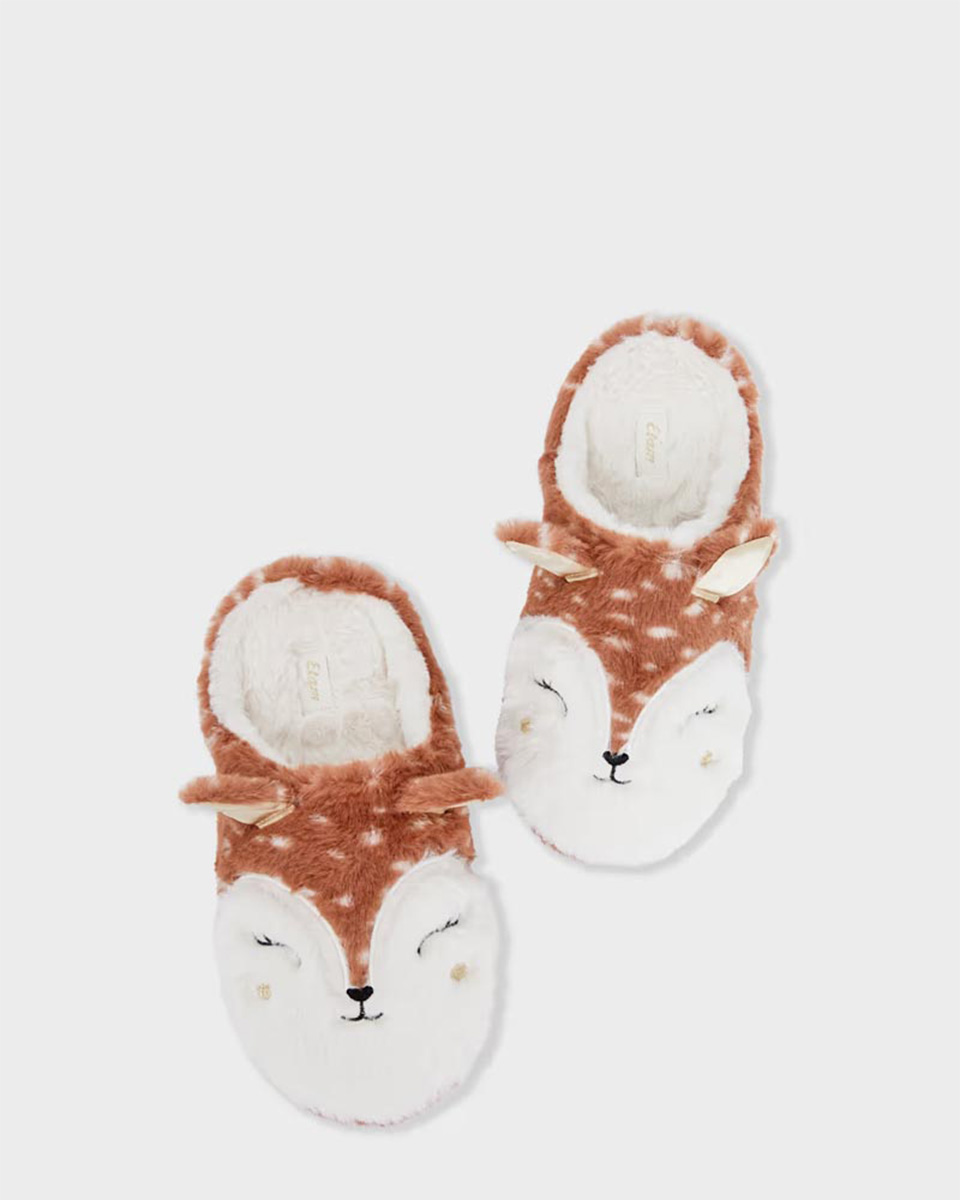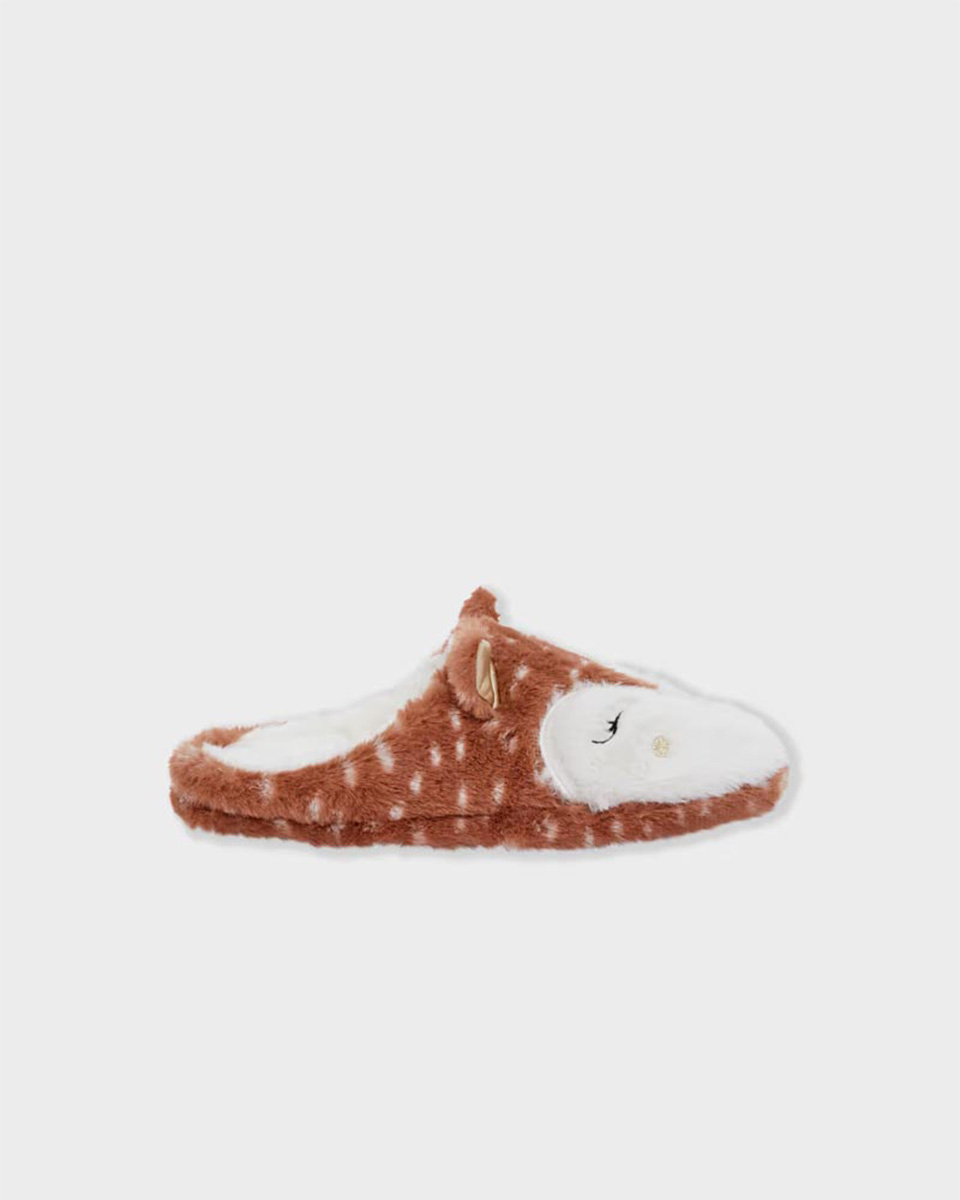 “Designed in the shape of a doe, these faux fur mules are ideal for staying warm during the winter.”