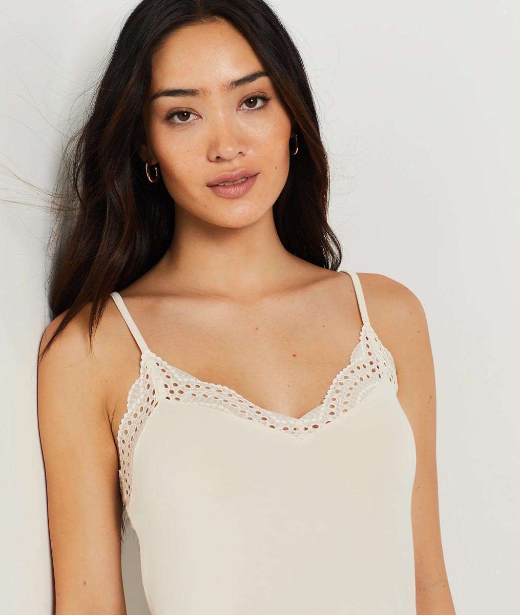 Choose soft and gentle nights with this modal camisole. Featuring thin adjustable straps, it showcases a subtle neckline edged with lace featuring graphic patterns.