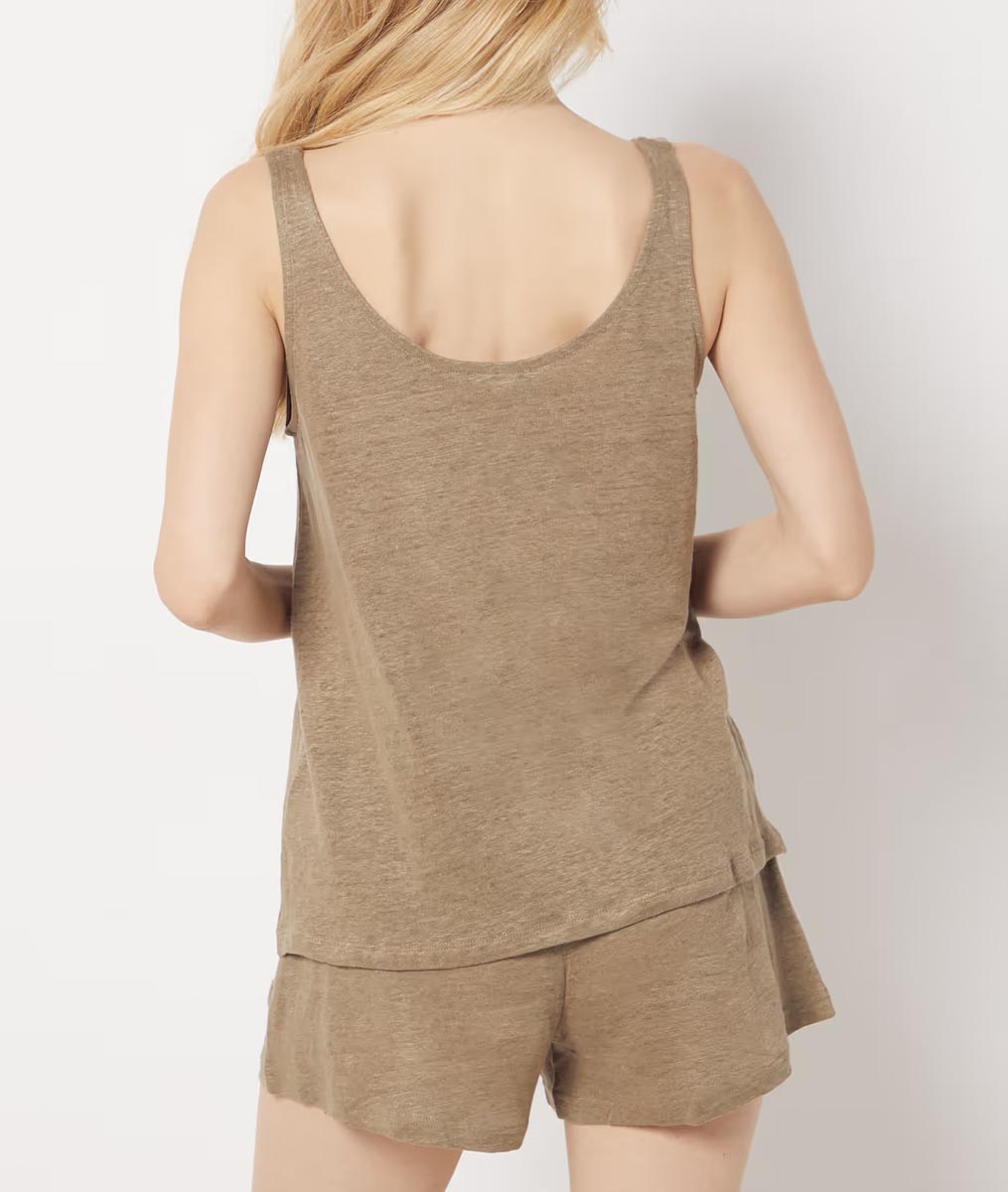 This sleeveless pajama tank top, with a round neckline, reveals a 100% linen material, lightweight and ultra-comfortable for a good night’s sleep.