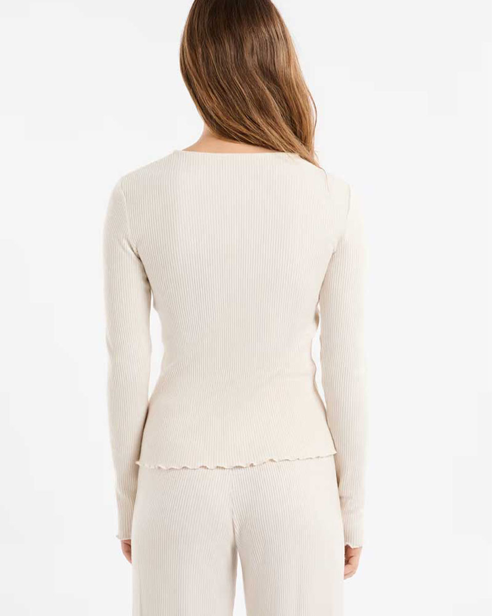 “Made from soft material, this long-sleeved t-shirt features a round neck. It is distinguished by a buttoned tab at the shoulder.”