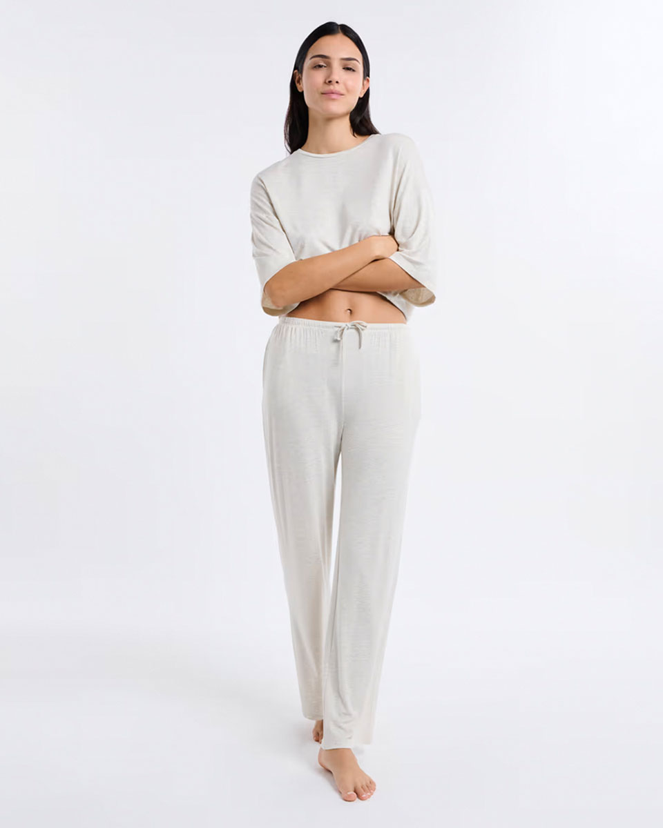 “Comfortable and lightweight, these wide-leg modal pajama pants ensure a pleasant softness for peaceful nights. Their breathable fabric provides a feeling of well-being throughout the night.”